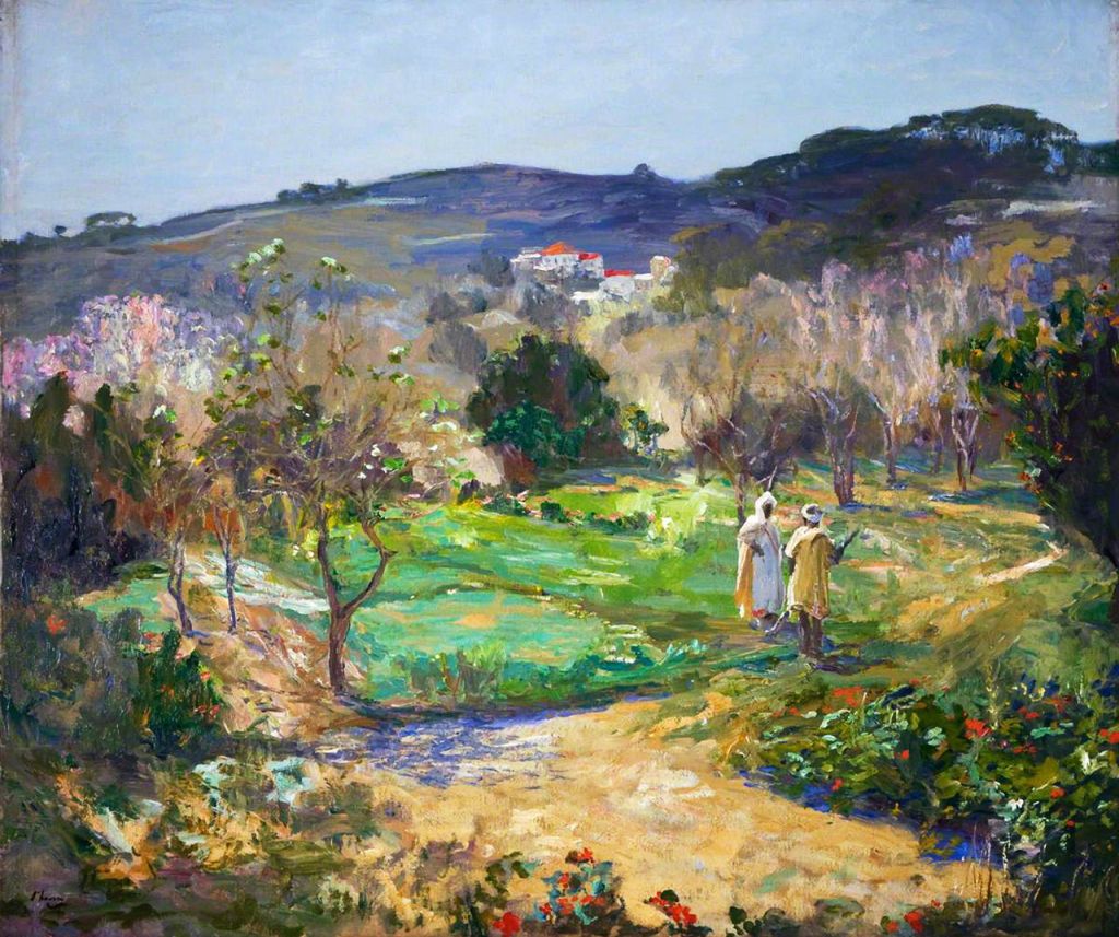 This landscape with trees in blossom was almost certainly painted in Morocco, judging by the dress of the two figures.