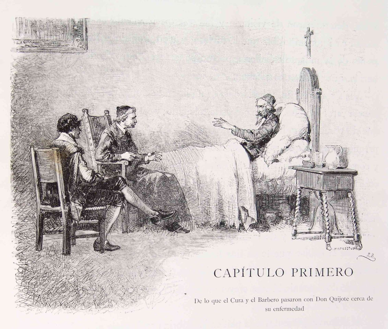 Their conversation turned to the matter of the squire’s promised governorship of islands, before the graduate criticised the inclusion of the whole of the tale of Inappropriate Curiosity as being out of place in the book. Don Quixote tried repeatedly to find fault with the book, but was reassured that it was faultless.