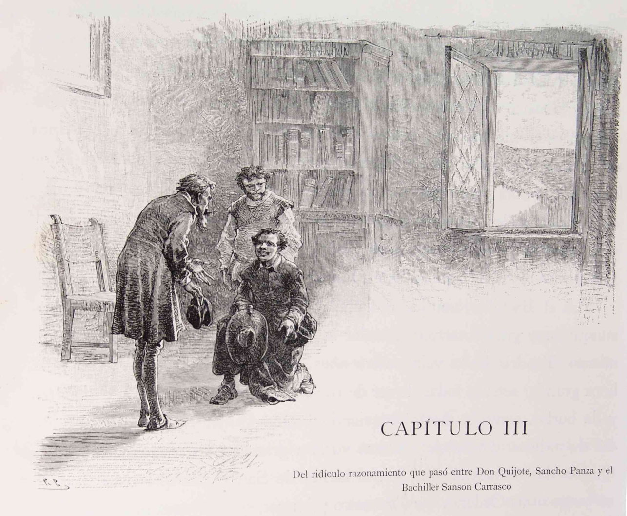 Don Quixote and Sancho Panza discussed their previous adventures, the knight insisting how he had felt for the suffering of his squire. Sancho Panza revealed that ordinary people thought they were both mad, and that their story had been published in a book. Don Quixote therefore asked his squire to fetch the young graduate of Salamanca University who claimed to have seen a copy.