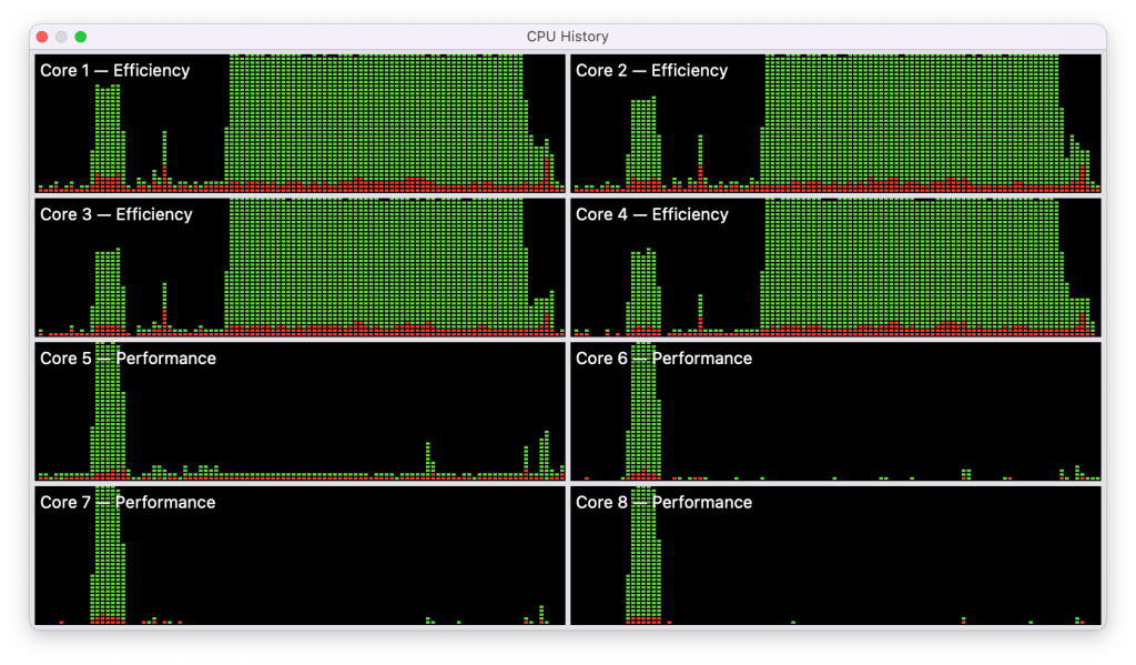 The first run, at the left, shows all four Performance (Firestorm) cores maxing out, and the Efficiency (Icestorm) cores at well over 50%. That was the first compression, performed with a QualityOfService of userInteractive (33). The second compression, of the same large file, is seen only in the Efficiency cores, where it maxes them out for much longer without any of the load being shared by the Performance cores. That was run with a QualityOfService set to background.