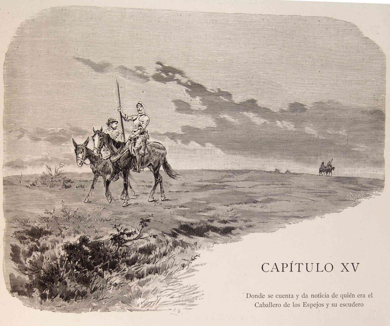A horseman then drew up from behind them and they exchanged greetings. The knight invited him to ride with them, reassuring the traveller that Rocinante wouldn’t misbehave with his mare. Don Quixote explained his role and history as a knight errant, giving himself the name of the Knight of the Sorry Face. After a long silence, the traveller expressed his amazement and disbelief that such knights still existed.