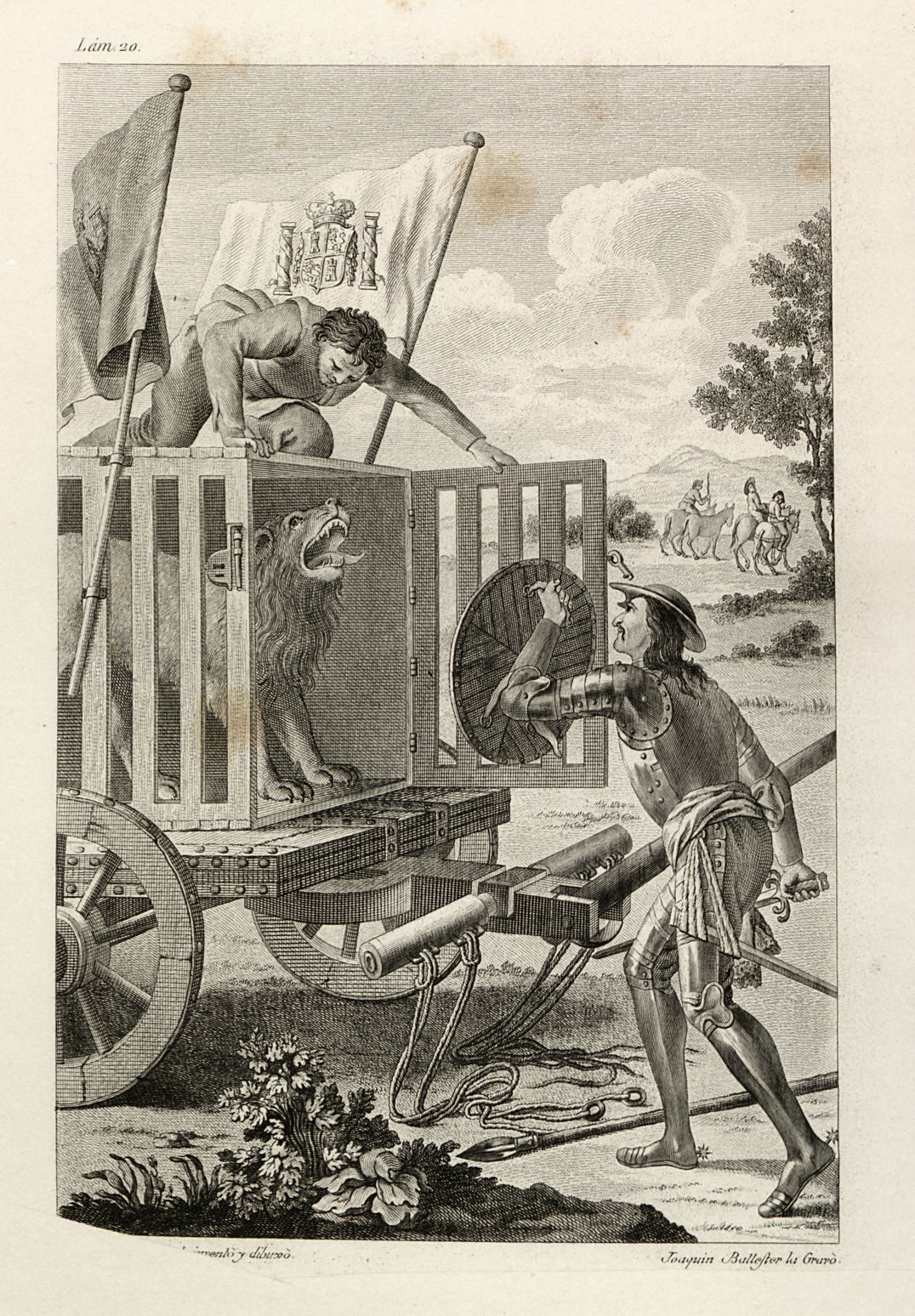 Don Diego watched as the two agreed that this too must have been the work of enchanters. The knight then readied himself to join battle with Satan himself, and stopped in front of the cart to demand of the two men accompanying it what they were doing. They told him they were carrying two lions in crates as a present from Oran to the King. The lions were very large, one male and the other female, and both were hungry as they hadn’t eaten that day. With that they warned the knight to get out of their way so they could proceed to a place where they could feed them.
