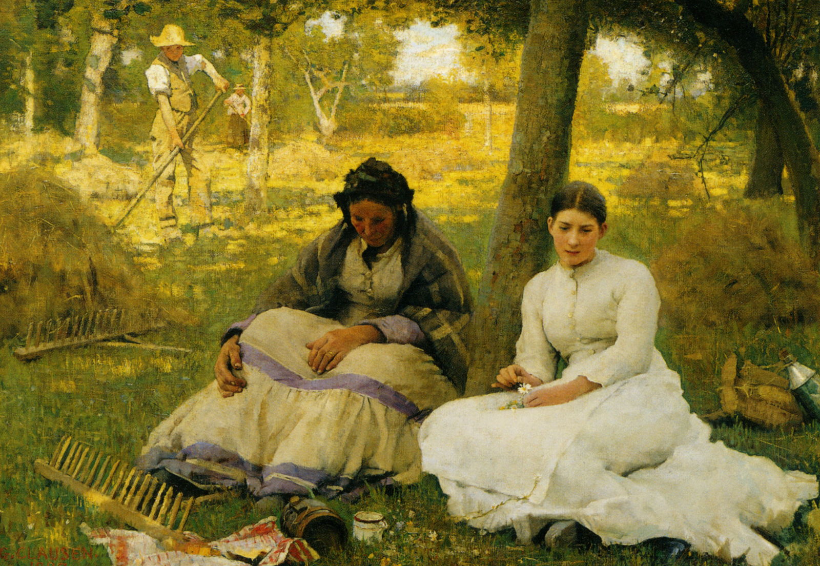 It was at Childwick Green that he started to paint realist scenes of the countryside, particularly of its many manual workers. Following the lead of Jean-François Millet, and under the more contemporary influence of Jules Bastien-Lepage and Léon Lhermitte, his peasants were not romanticised but gritty and wrinkled. Among his more successful paintings of this period is Day Dreams (1883), which is also one of his earliest works to show a particular interest in light and colour.