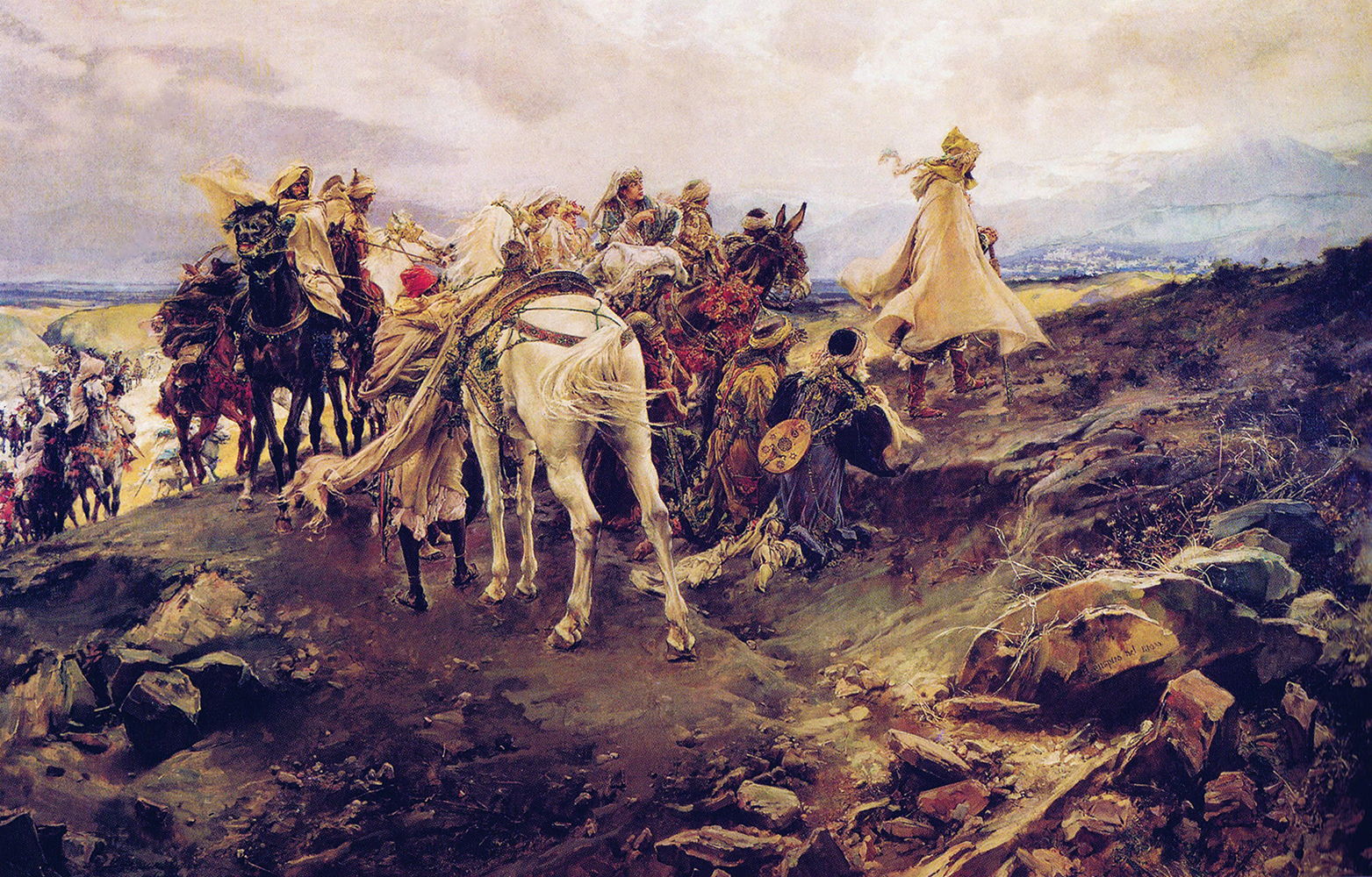 Pradilla shows the former ruler dismounted, after he had walked over to take his last look at Granada in the distance. Although this was painted in oils, the hills behind Granada appear as if they had been painted using watercolour washes – an unusual effect demonstrating his technical skills.