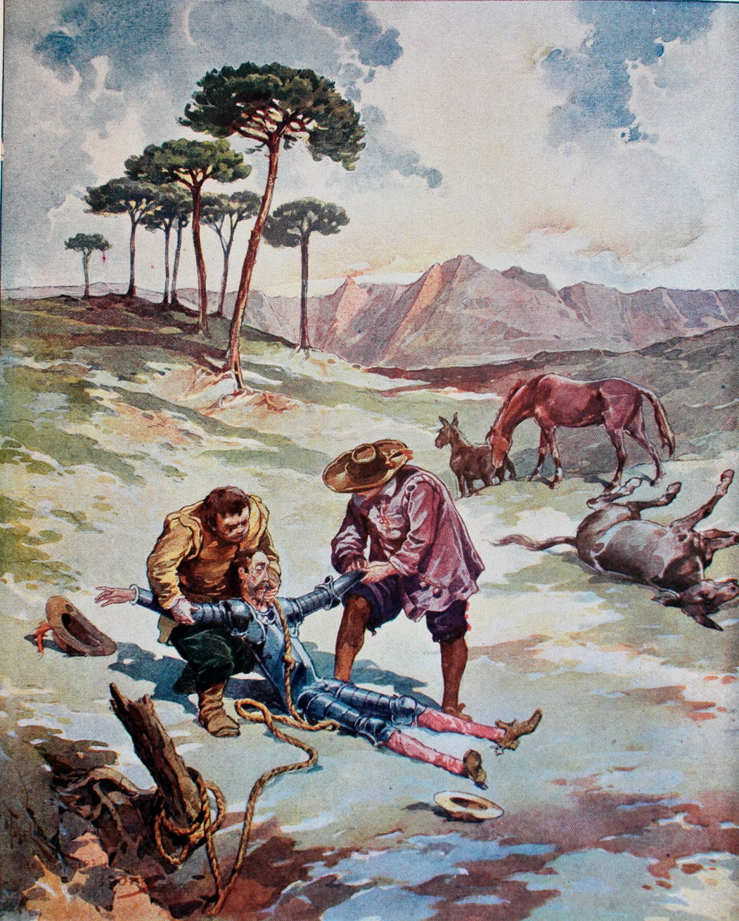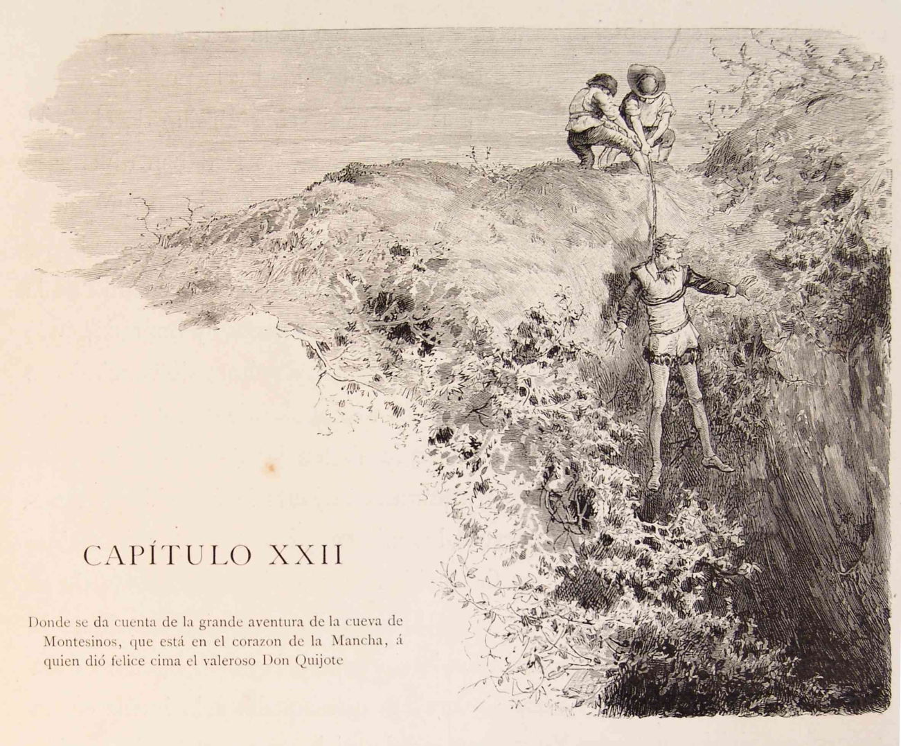 Despite that ill-omen, Sancho and the guide gradually lowered the knight until they couldn’t hear him any more and they had run out of rope. They waited half an hour before starting to haul the rope back in. At first it came easily, until they reached the point where they were pulling up the knight’s weight. He remained unusually silent, and when they pulled him out at the top he appeared to be asleep. They untied him and eventually managed to wake him up.