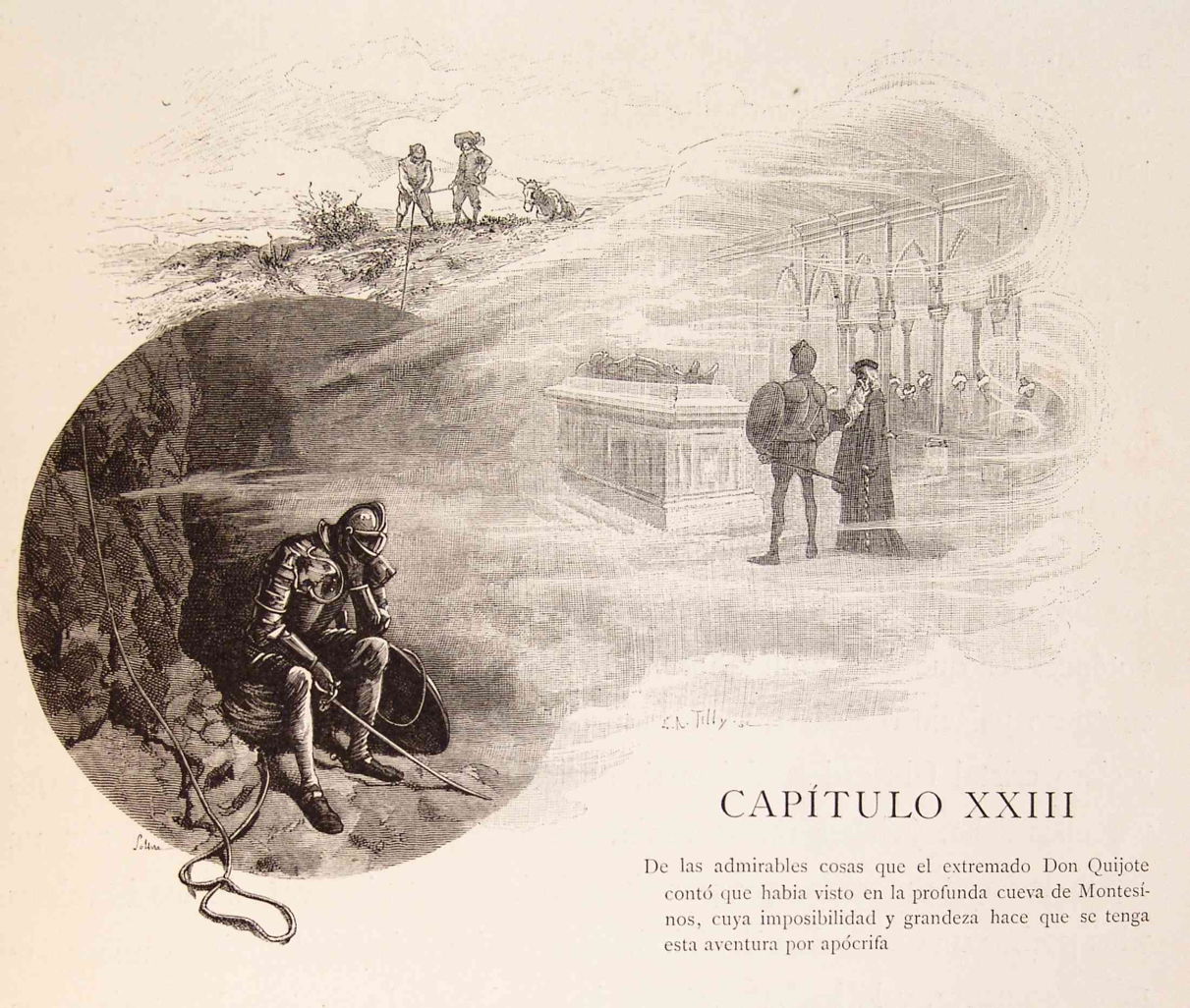 At that point in his account, the guide interrupted, wondering how Don Quixote could possibly have done all this when he had only been in the cave for such a short time. Don Quixote, though, reckoned that he’d been down there for three days and nights. Sancho Panza wrote it all down to enchantment, which his master accepted, and confirmed that none of them down there had eaten or slept when he was with them.