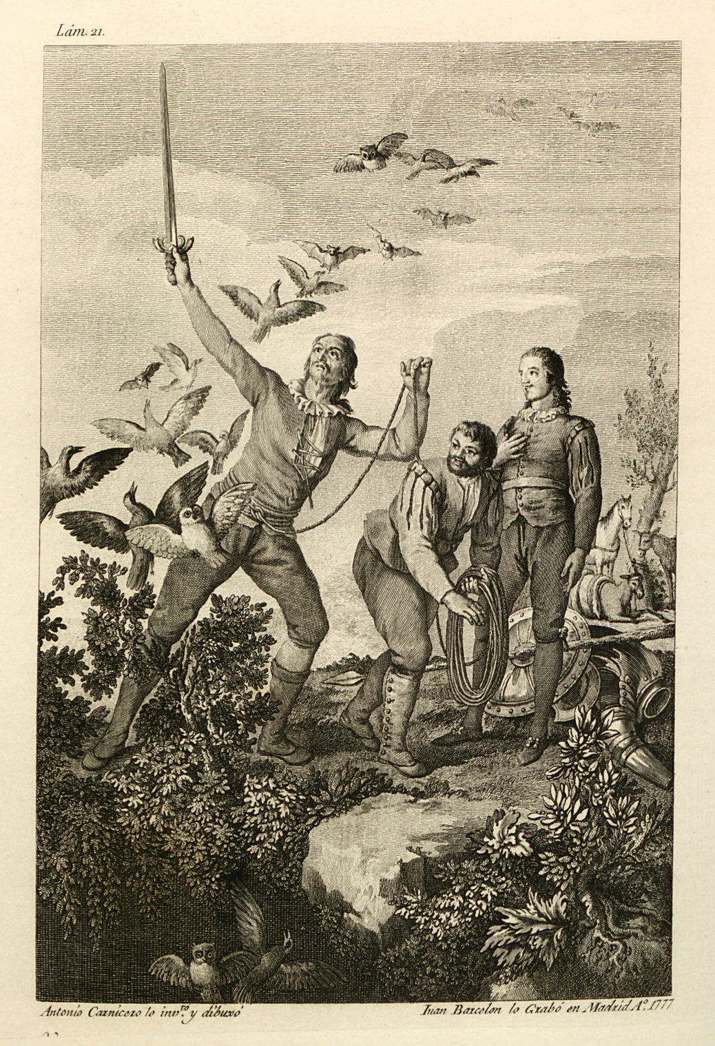 At the mouth of the cave, Sancho Panza and the guide helped Don Quixote to fasten himself to a long rope, ready to descend to its depths. The squire cautioned his master, who once again told him to shut up. The guide asked the knight to look out for anything which could be of use in his writing. After he had said a short prayer, Don Quixote hacked away the vegetation blocking the entrance with his sword. As he did so a stream of huge ravens flew out, knocking the knight to the ground.