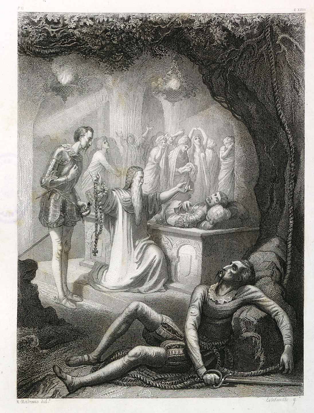 The old man first confirmed the story that he had followed his best friend’s dying wishes to cut out his heart when he had died and take it to his lady. Following that he showed the knight his friend’s tomb in the castle, on which the body lay enchanted. When Montesinos stopped speaking, his friend called out his dying wishes again. The old man explained that had already been done, went on to talk about the Lakes of Ruidera, and to introduce Don Quixote as a great knight whose visit had been prophesied by the wizard Merlin.