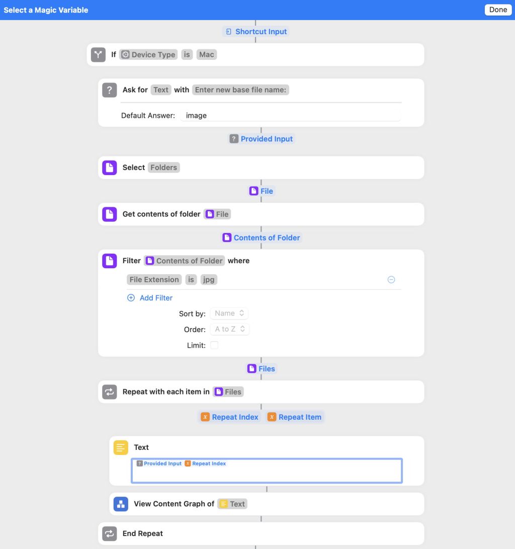 Before going further and changing any file names, it’s a good idea to check that these names are being formed correctly. Although there are other ways, allow me to introduce one of Shortcuts’ debugging tools: the Content Graph. Immediately after the Text action, add a View Content Graph action. Prepare a test folder with a few image files with the correct .jpg extension, and run your shortcut on that test folder. Each time the code reaches that action, it will display the output of the Text action, allowing you to check that it’s ready to be used to rename files.