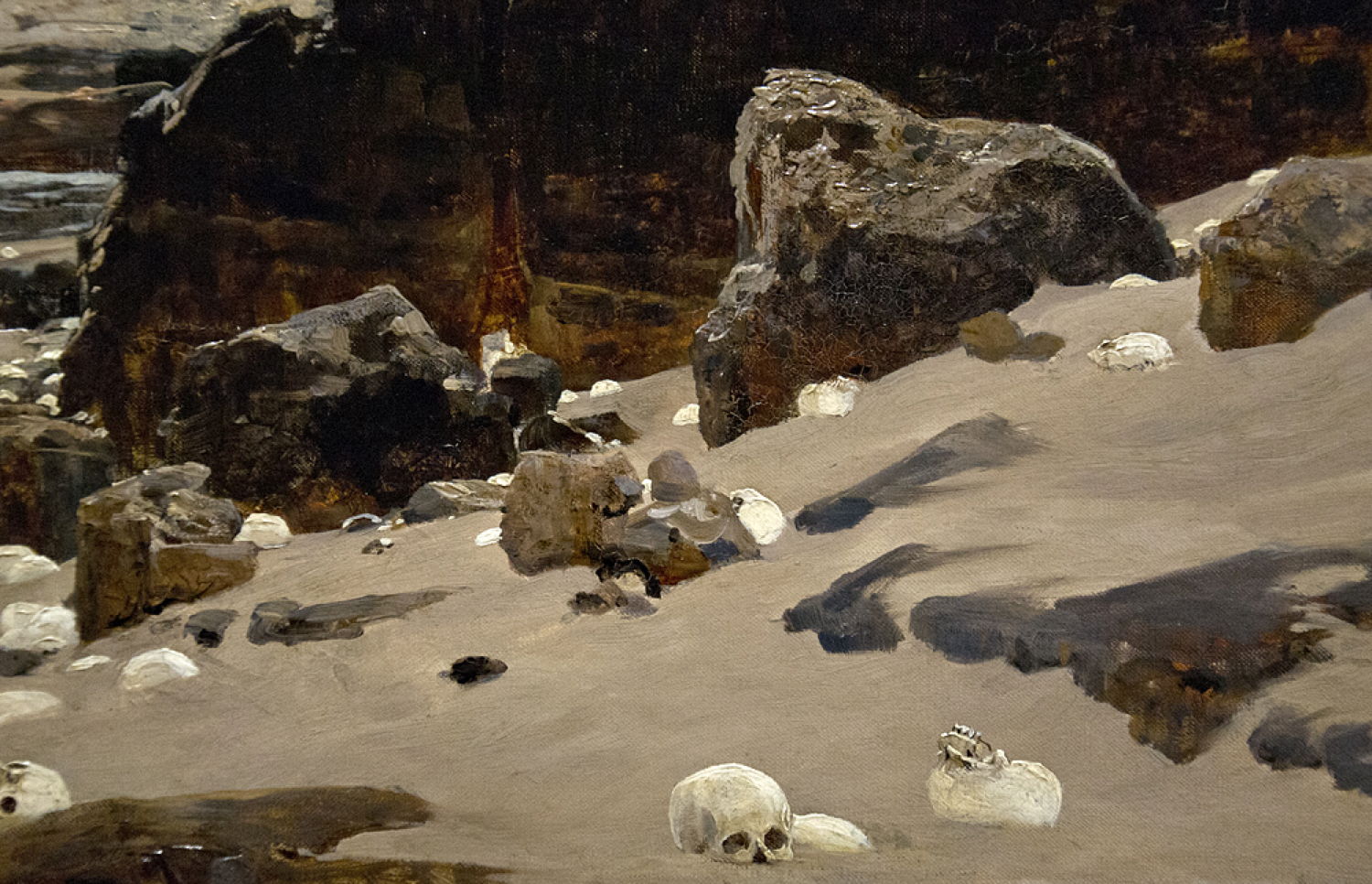 On a remote and forbidding shore, below towering rock slabs, small waves lap on the sandy beach beneath snow-slopes. The low sun lights the top band across the rocks, while behind is a dense and dark bank of cloud. Scattered across the beach are large numbers of bleached white objects, which on close examination (detail below) are human skulls, apparently washed up by the water. This is the apocalypse, all that remains of the human race, oblivion for humankind.