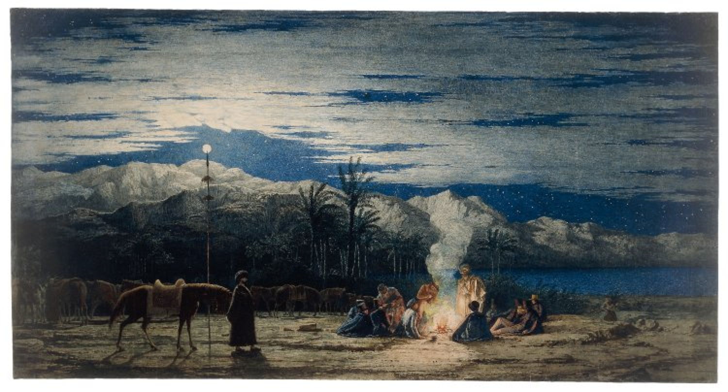 Dadd’s watercolour of a Halt in the Desert (c 1845) is an outstanding landscape view. An unusual and haunting nocturne, it shows Phillips’ party seated around a fire, on the shore of the Dead Sea. Phillips is stood behind the fire, lit by it.
