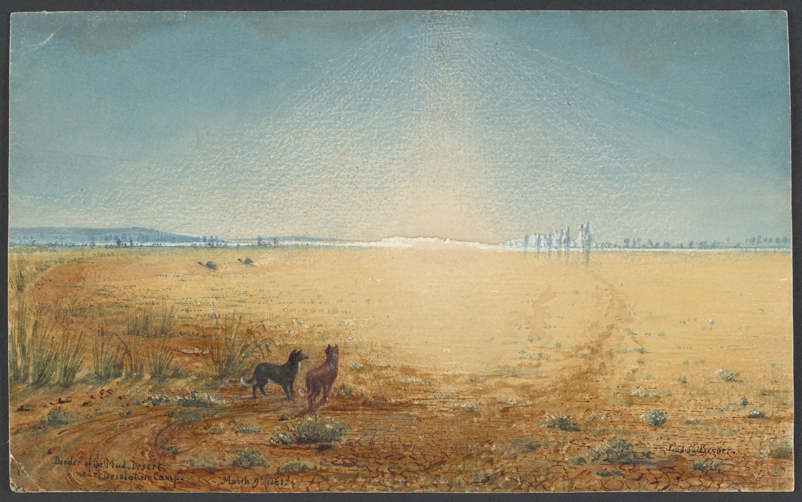 Becker painted this watercolour view of the Border of the Mud-Desert near Desolation Camp on 9 March 1861, as his health was rapidly deteriorating. He finally died on 29 April 1861, in their camp at Bulloo, from dysentery complicated by scurvy. He completed seventy watercolours, drawings and maps during the expedition, at times going without food and sleep in order to work. Six other members of the expedition also died, including its leader Robert O’Hara Burke.