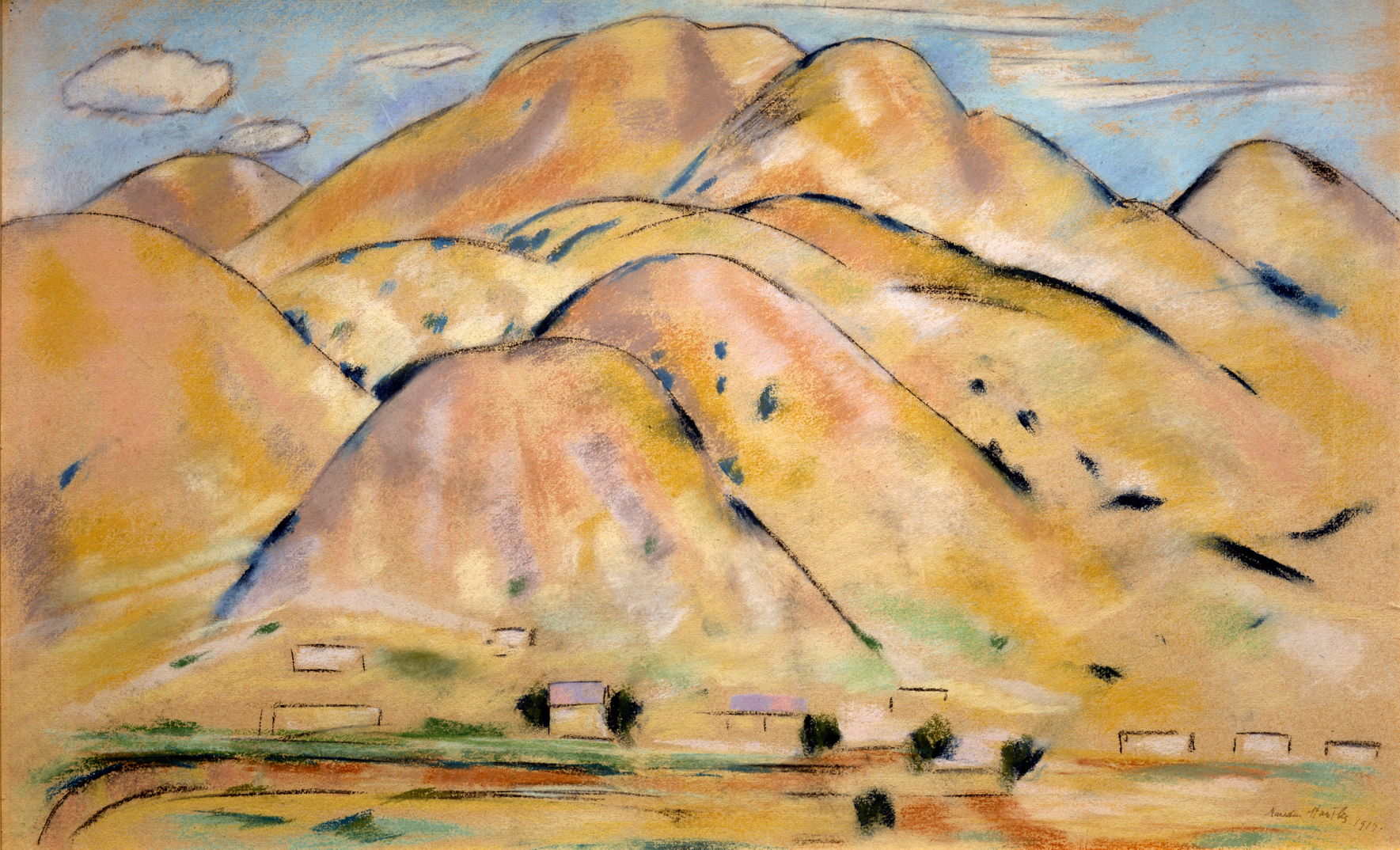 When Marsden Hartley returned to the USA from Berlin in 1915, he resumed landscape painting, and visited New Mexico from June 1918, where he repeatedly painted the landscapes of Arroyo Hondo (1918), here in pastel. Hartley claimed that this area was “the only place in America where true color exists, excepting the short autumnal season in New England.”
