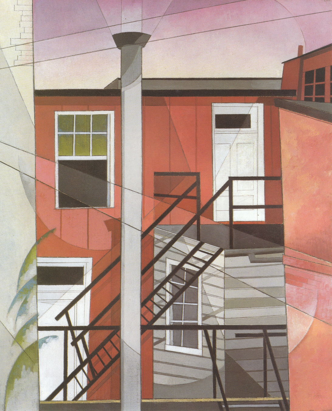 In 1919, the American artist Charles Demuth started painting a series of Precisionist landscapes/cityscapes in oils, which he continued intermittently until 1933. Part of that series, Modern Conveniences is based on the rear view of a building close to Demuth’s family home in Lancaster, Pennsylvania.