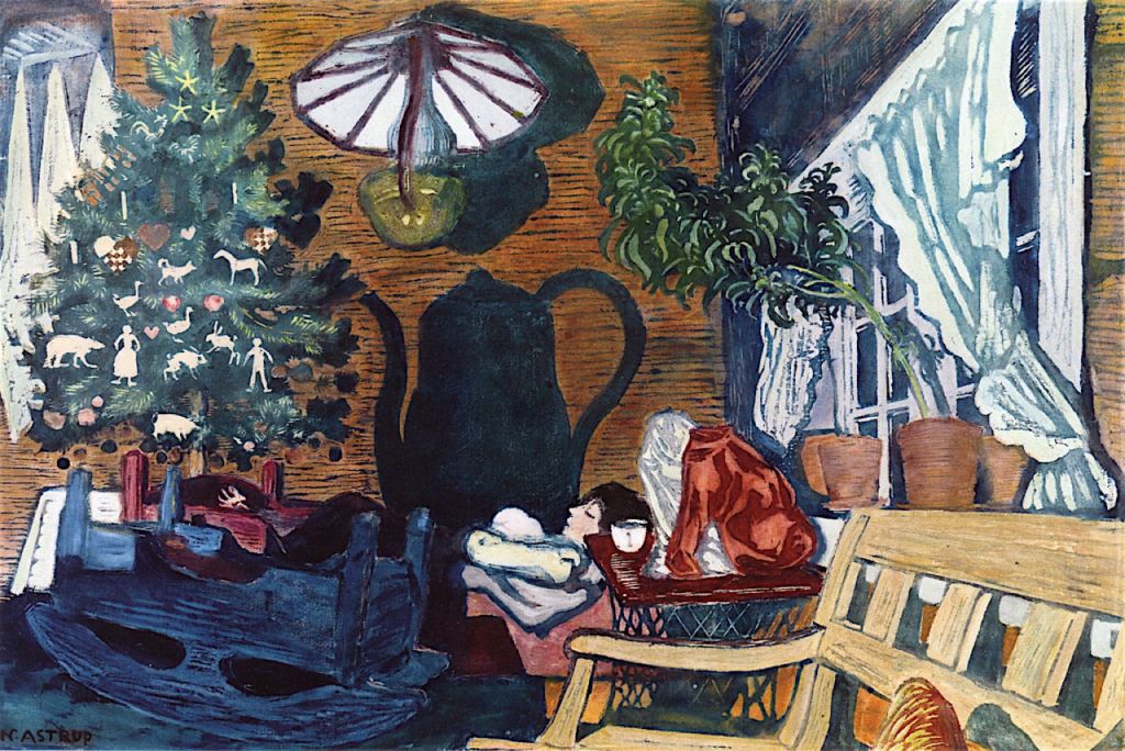 In Nikolai Astrup’s woodcut print of his family’s Christmas Eve at Sandalstrand from 1918, his wife and young son have fallen asleep exhausted, amid traditional Norwegian decorations, including a well-decked tree.