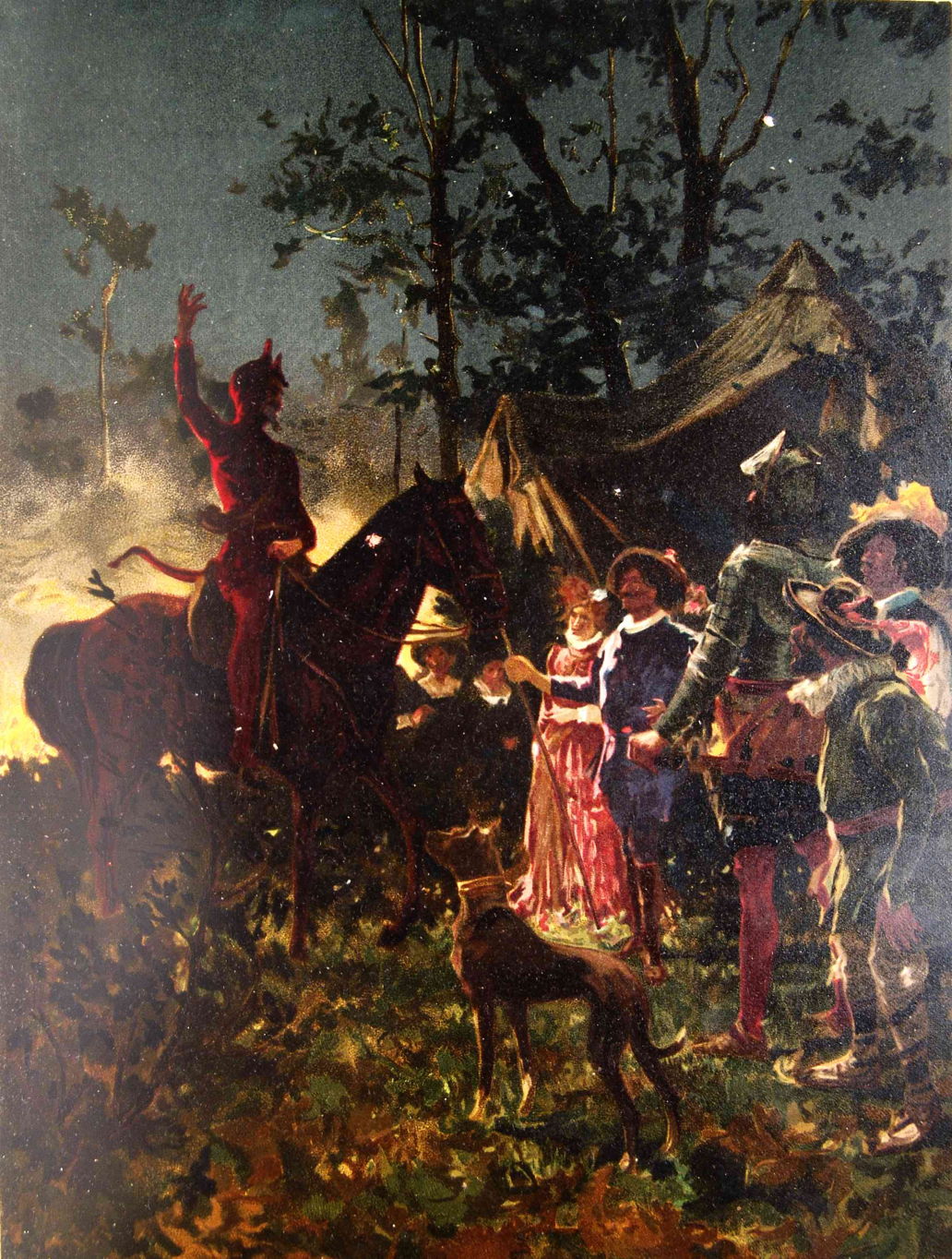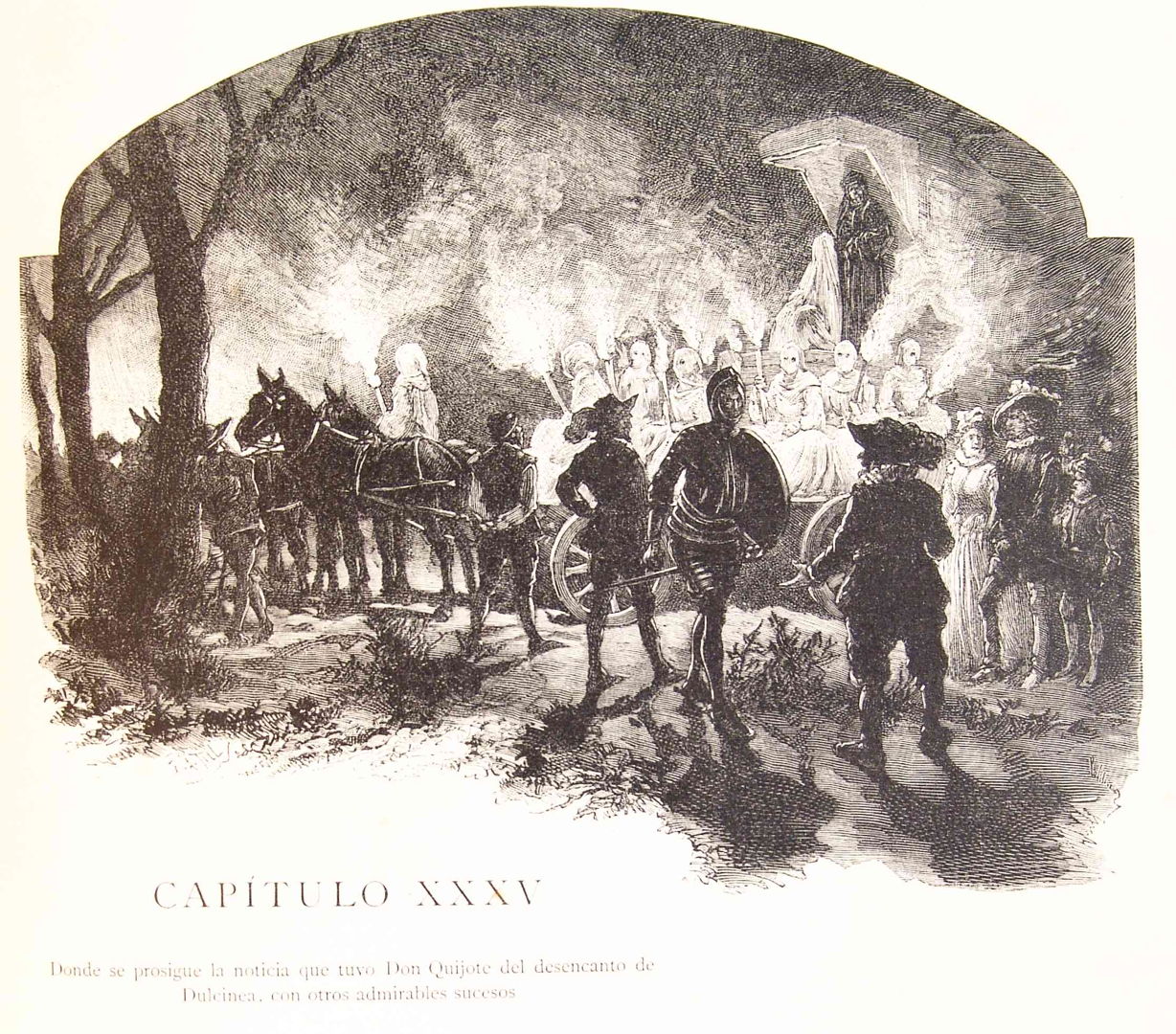 Once it was dark the wood came alive with fires, the calls of bugles, and the cries of Moors going into battle. The Duke and Duchess were surprised, while the knight was struck dumb and his squire terrified. A messenger then appeared before them, looking like the devil himself. When the Duke challenged him he said he was looking for Don Quixote, as there were six troops of enchanters riding through the wood, bringing the lady Dulcinea on a chariot, with instructions as to how she could be disenchanted. The messenger then rode off with a ghostly blast on his horn.