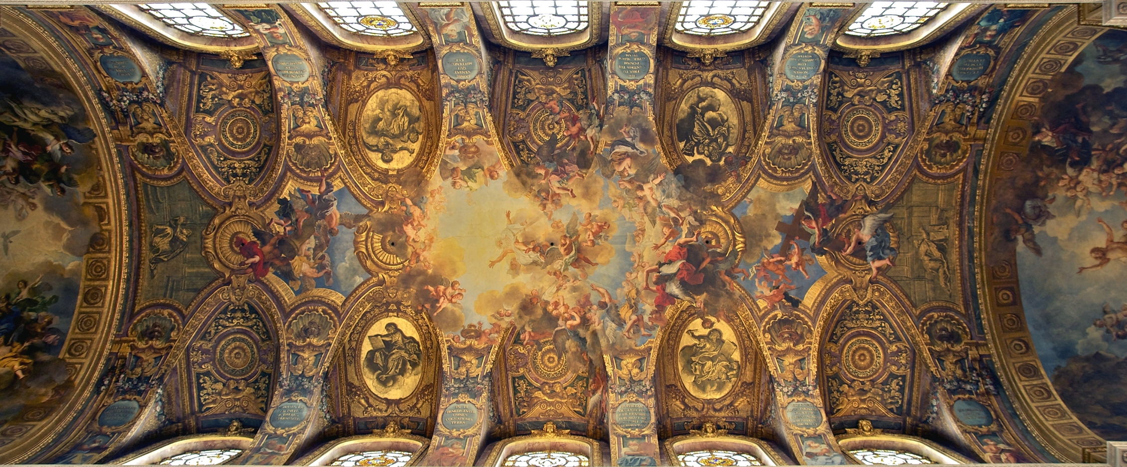 The central area shows Almighty God the Father (below), with two smaller scenes at each end, with the overall full title of God the Father in His Glory Bringing to the World the Promise of Redemption. This was the fifth chapel to be built at Versailles, and was begun in 1689, and finally consecrated in 1710, as the last monumental building of Louis XIV. It has since been deconsecrated, and is now used as a venue for state and private events.