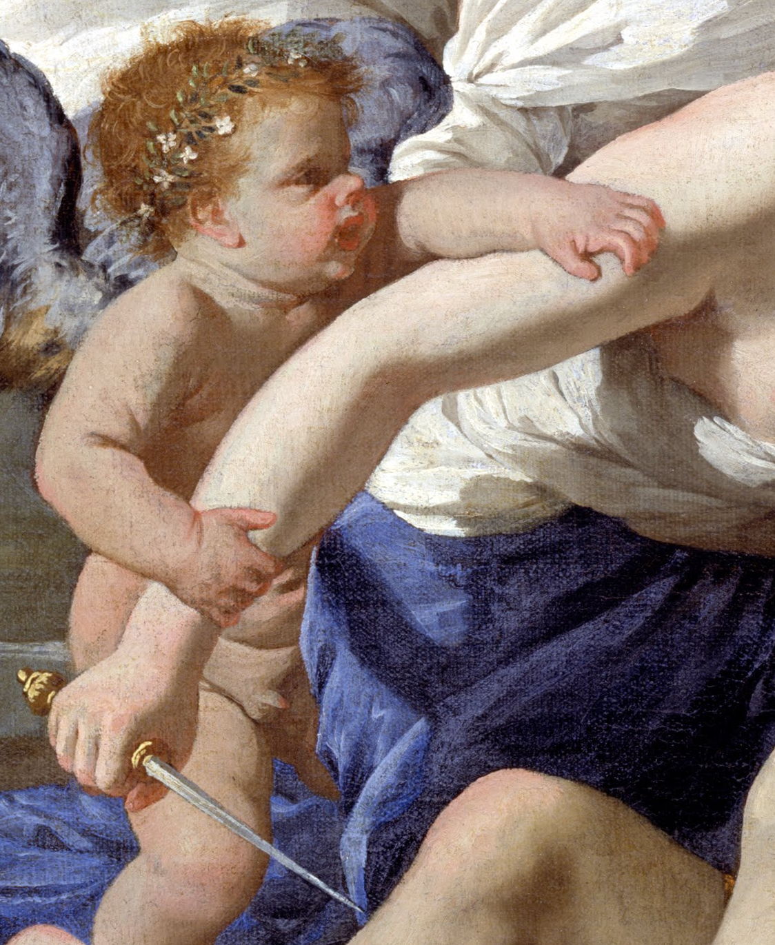 Just as she is about to do this, she falls in love with him instead – and this is the instant, the twist or peripeteia (to use Aristotle’s term), shown here. A winged amorino, lacking the bow and arrows of a true Cupid, restrains her right arm bearing her weapon.