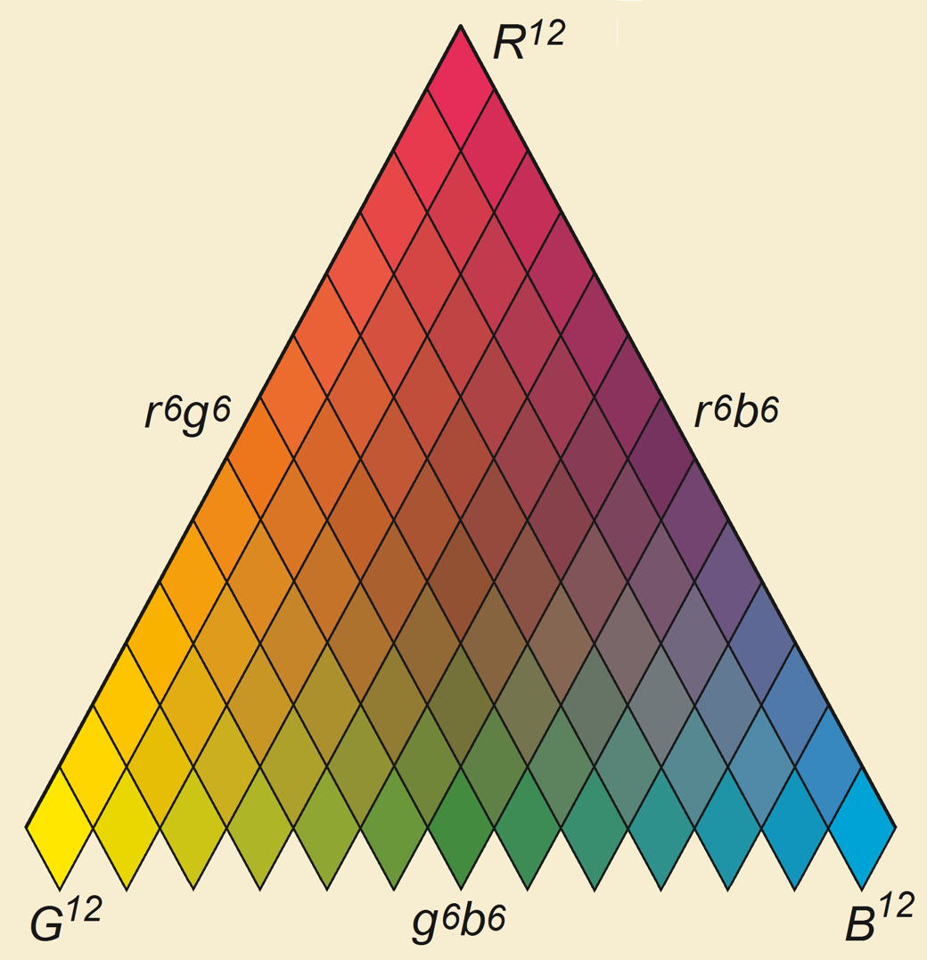 In 1758, Tobias Mayer (1723-1762) proposed this colour triangle, recreated here by Jacques Lacombe in 1792, which is impressively modern. With the three primaries forming its corners, it was the first expression of the painter’s acquired knowledge that all colours could be mixed from the three primaries plus black and white. Mayer envisaged assembling a series of triangles of diminishing size into a six-sided solid, with white and black as the polar vertices, and the three primaries forming its triangular equator, but never expressed this concept in a full model.