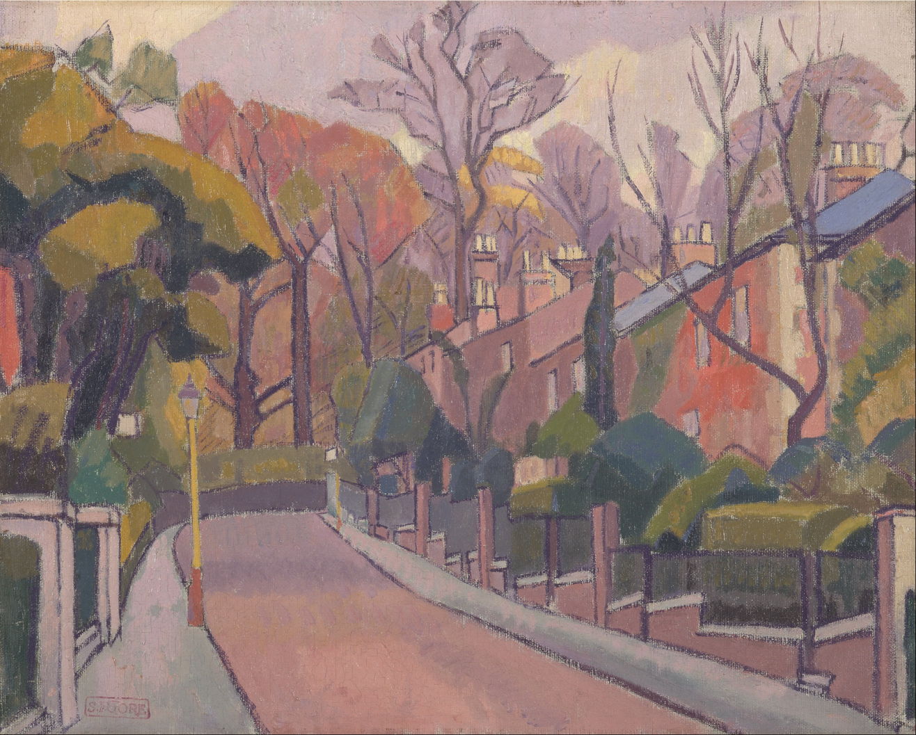 In August 1912, Gore and his heavily pregnant wife Mollie moved to Letchworth Garden City, where they kept Harold Gilman’s house at 100 Wilbury Road while he was in Scandinavia, following the break-up of his marriage. During this stay, Mollie gave birth to their first child, before the family moved back to Camden Town in London in November 1912. Over those few months Gore’s style changed markedly, under the influence of Fauvism and Cubism. His forms became simplified and emboldened as he modernised from his early Impressionism.