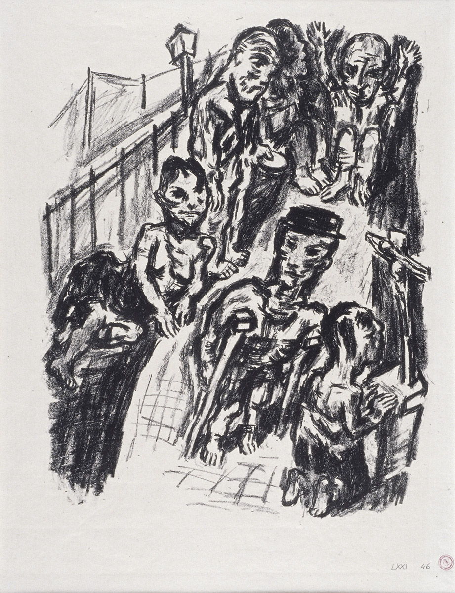 Beggars is an assortment of people from the street life of the city, and probably includes veterans of the Great War.