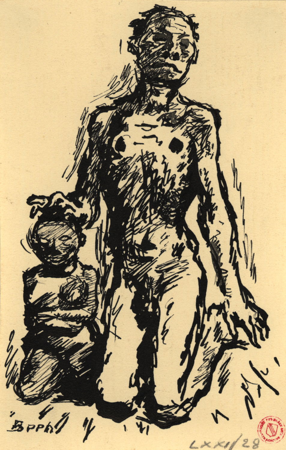 Woman with a Child is one of a series of roughly worked figures drawn in black ink on wove paper.