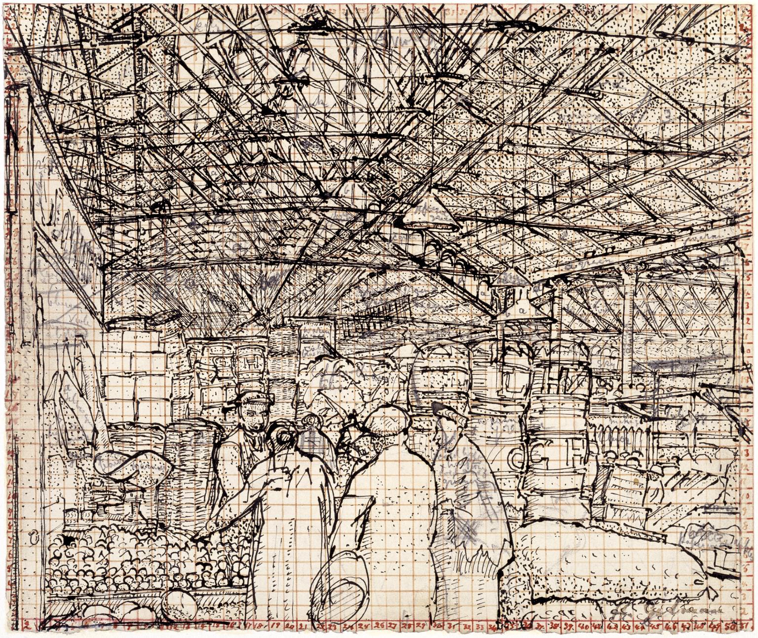 Back in England, still in about 1913, he drew this study of Leeds Market using ink and graphite. He squared the paper up using red ink into unusually small areas, for transfer to canvas in the finished painting below. During that, he rearranged the figures, but retained the meticulous geometry of the building. This building had only been constructed in 1901-04, and housed the fruit and vegetable stalls next to the grand central hall.