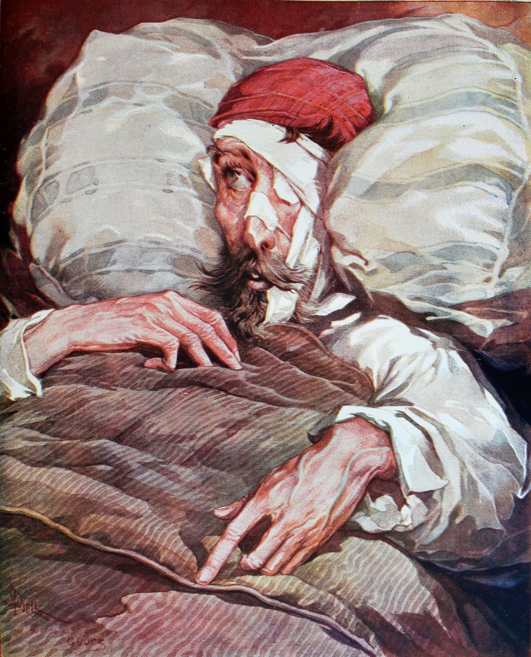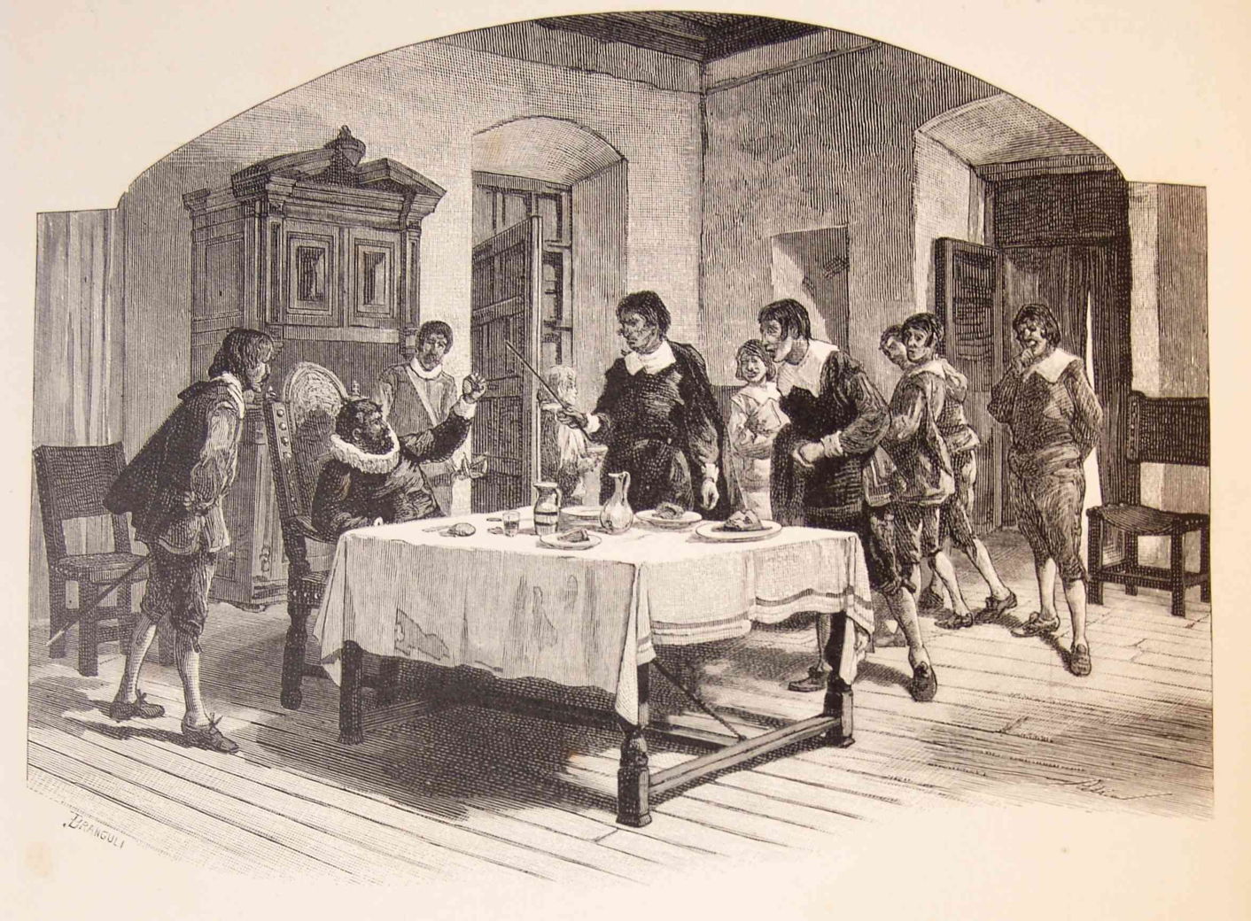 Don Quixote believed her, but then the bedroom door burst open, making the duenna drop her candle and plunge the room into darkness. Although the knight couldn’t see, the duenna was held by her throat while her skirts were lifted and she was slapped repeatedly with a slipper. Having dealt with her, the invisible figures then tormented Don Quixote by pinching his body for half an hour before leaving.