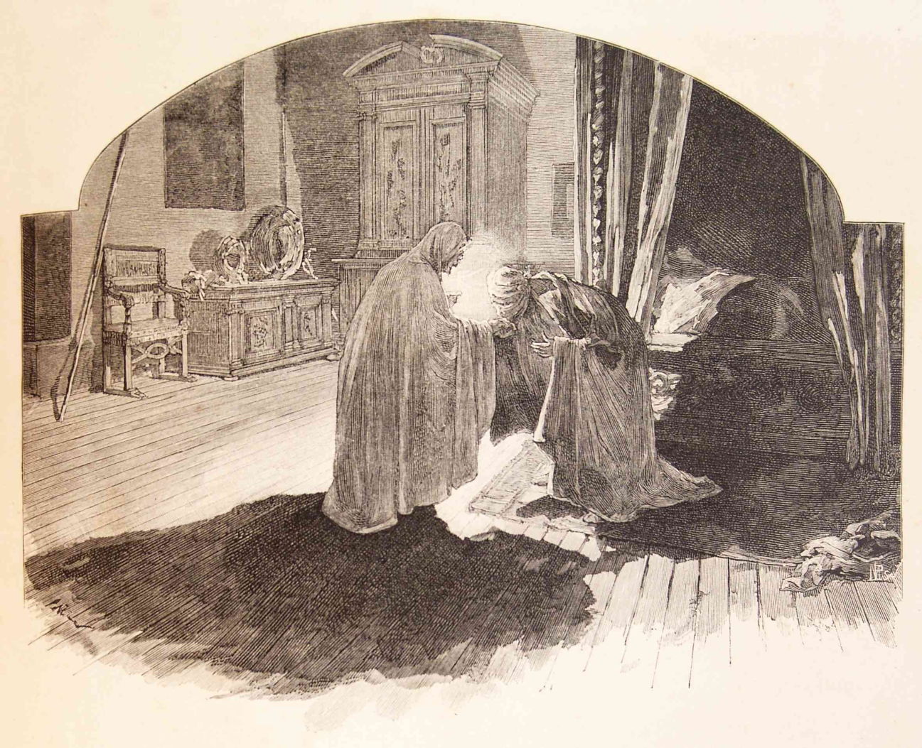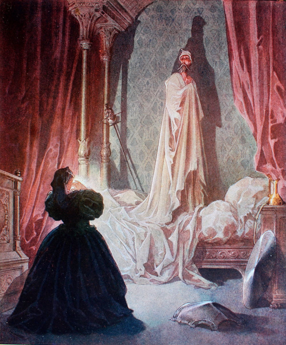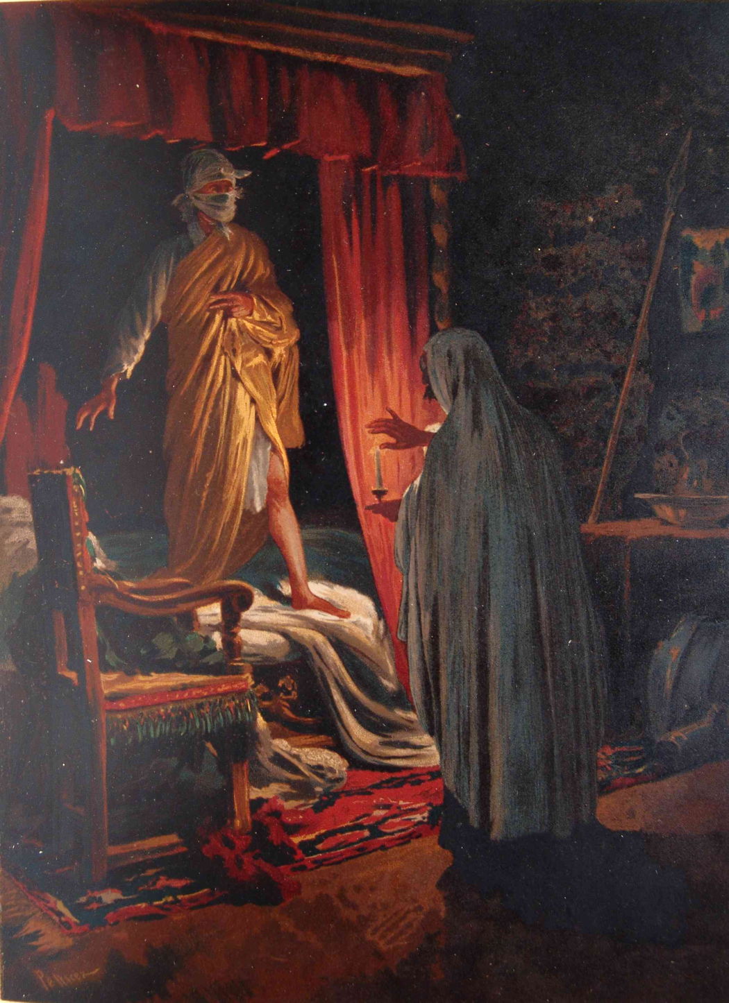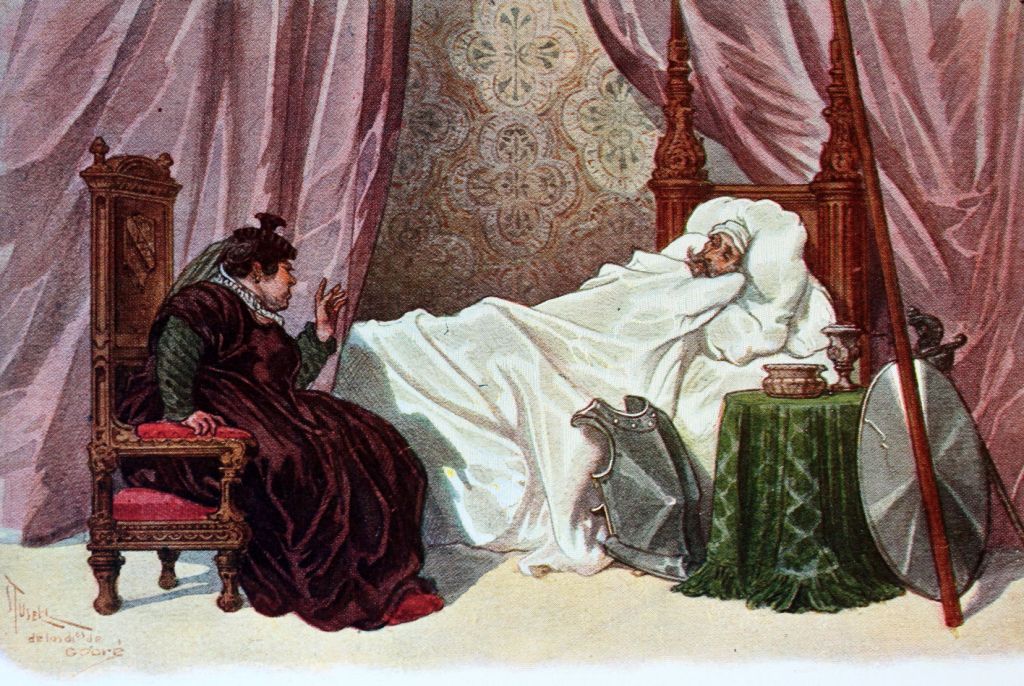 Meanwhile, back in the Duke and Duchess’s palace, Don Quixote was still recovering from his encounter with the cat. One night when he was in bed he heard his door being unlocked and presumed he was to be visited by the young Altisidora. Instead it turned out to be an old duenna, who saw the knight standing on his bed like a ghost, and promptly dropped her candle then fell over her own skirts.