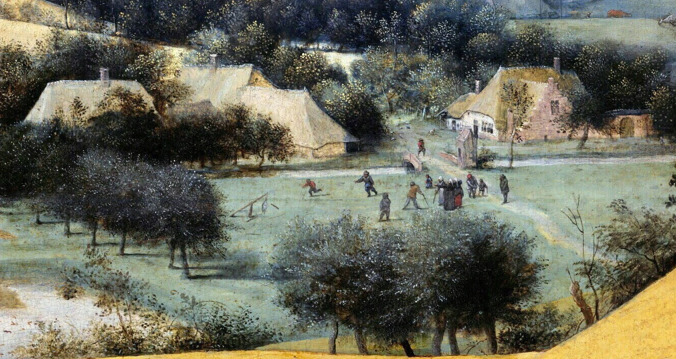 In the village, those too old or infirm to be out in the fields are entertaining those too young. Interesting omissions by Bruegel are the processes of threshing followed by winnowing, to separate edible grain from the chaff and straw.