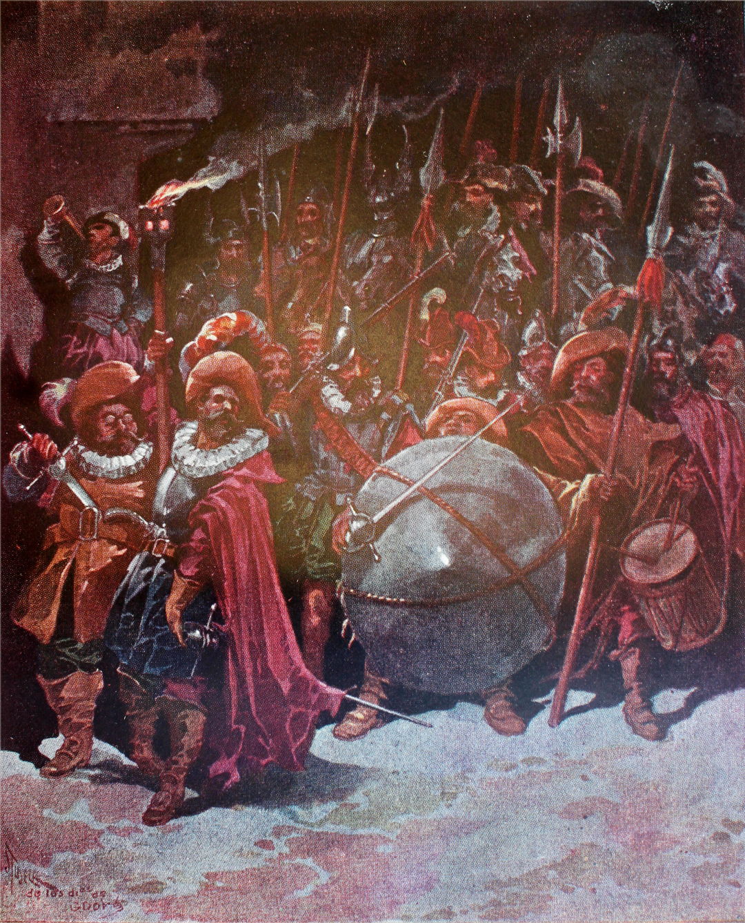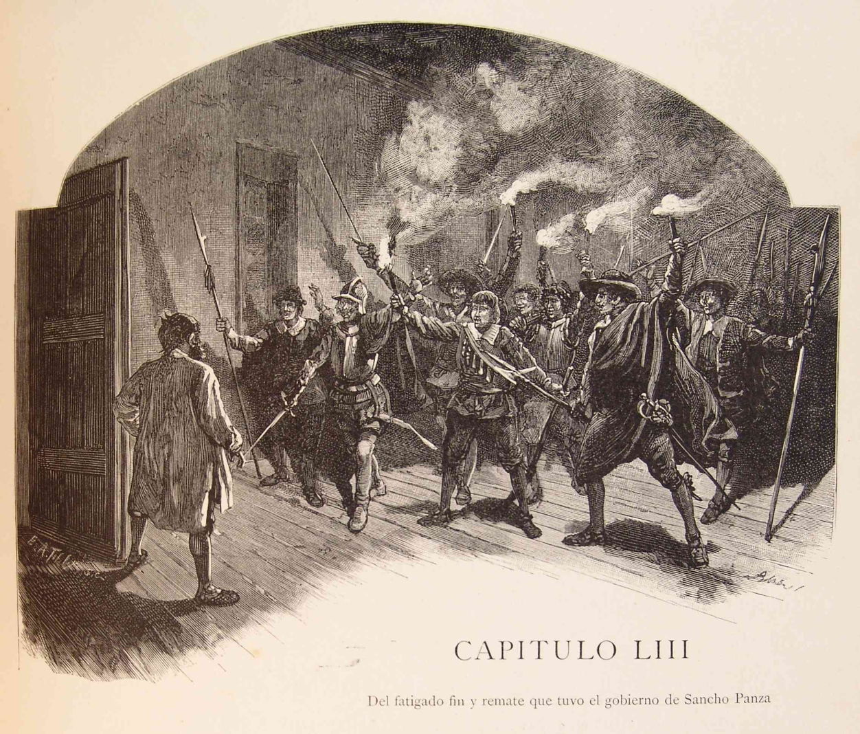 Sancho lay still hungry in bed on his seventh night as governor, and just as he was about to fall asleep was disturbed by a great noise of ringing bells and shouting. He raced from the door of his bedroom to see a rush of people calling him to arms to respond to an invasion by the town’s enemies.
