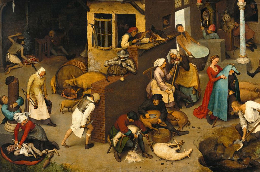 Armed with a compendium of proverbs of the day, the painting finally makes sense. I won’t iterate my way through every one of the 112 different proverbs which have been identified, but show four detailed views which encourage you to work out the individual sayings as well as you can. The painting’s page on Wikipedia shows a detail view for each of the proverbs so far identified.