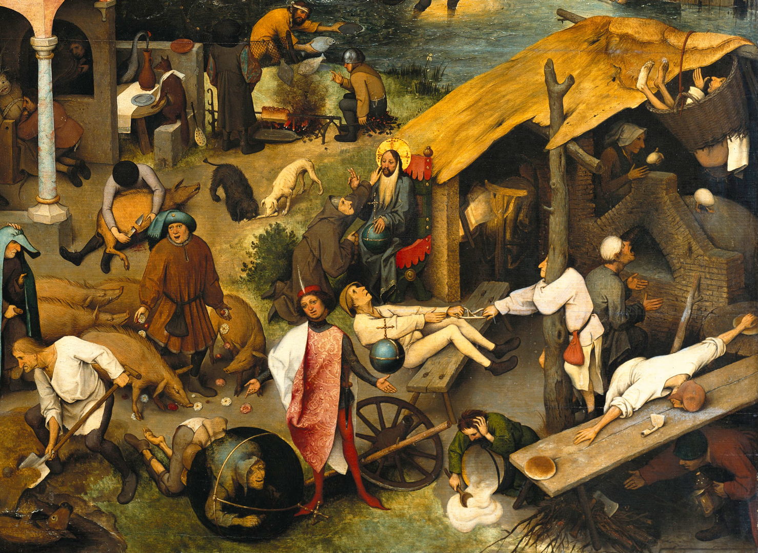 The upper part of the house shows how densely Bruegel has concentrated the proverbs. The broom poking out from the window is for sticking out the broom, which means having fun while the master’s away; the couple under it are marrying under the broomstick, or living together out of wedlock, and the odd circular objects on the roof represent having the roof tiled with tarts, meaning to be very wealthy.