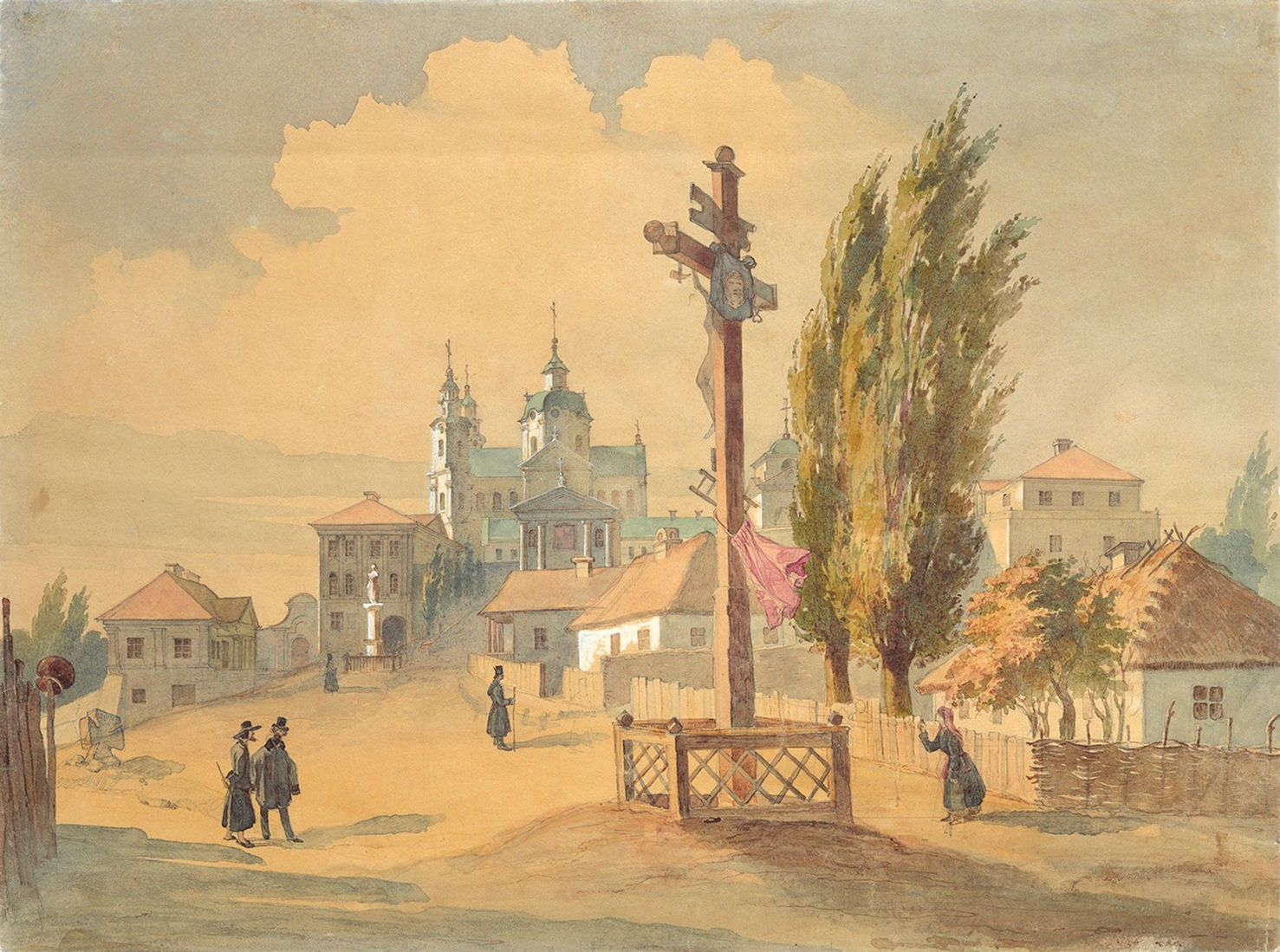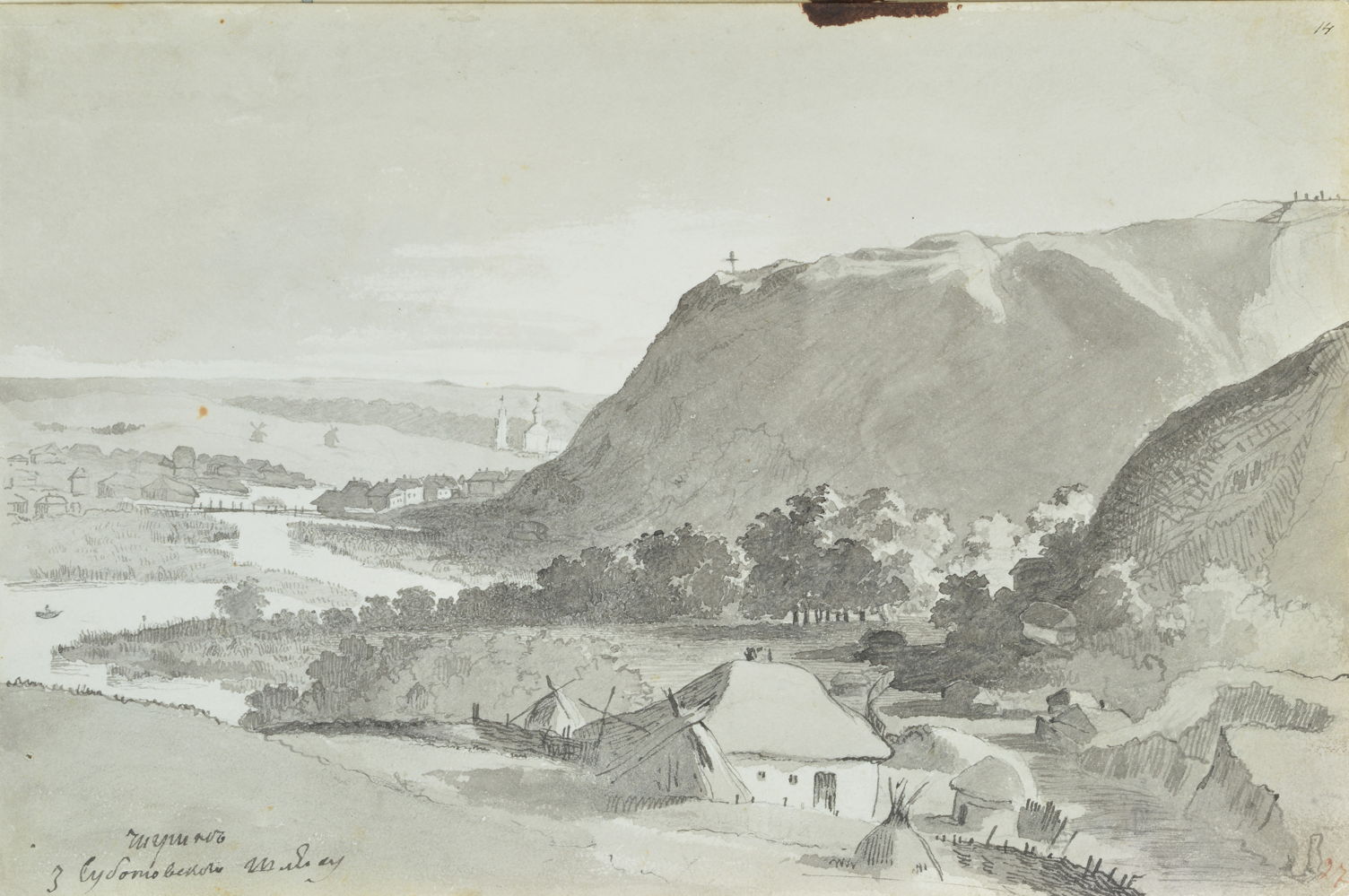 This view of Chyhryn from the Subotiv Way from a watercolour sketchbook of 1845 shows Chyhrynsky Convent in the background.