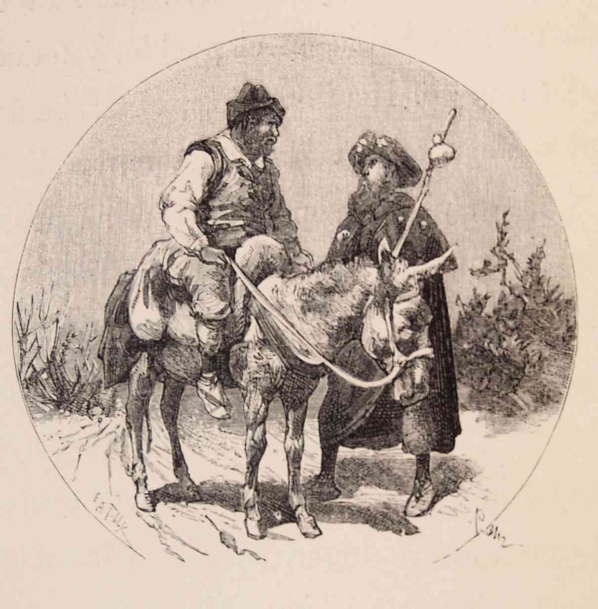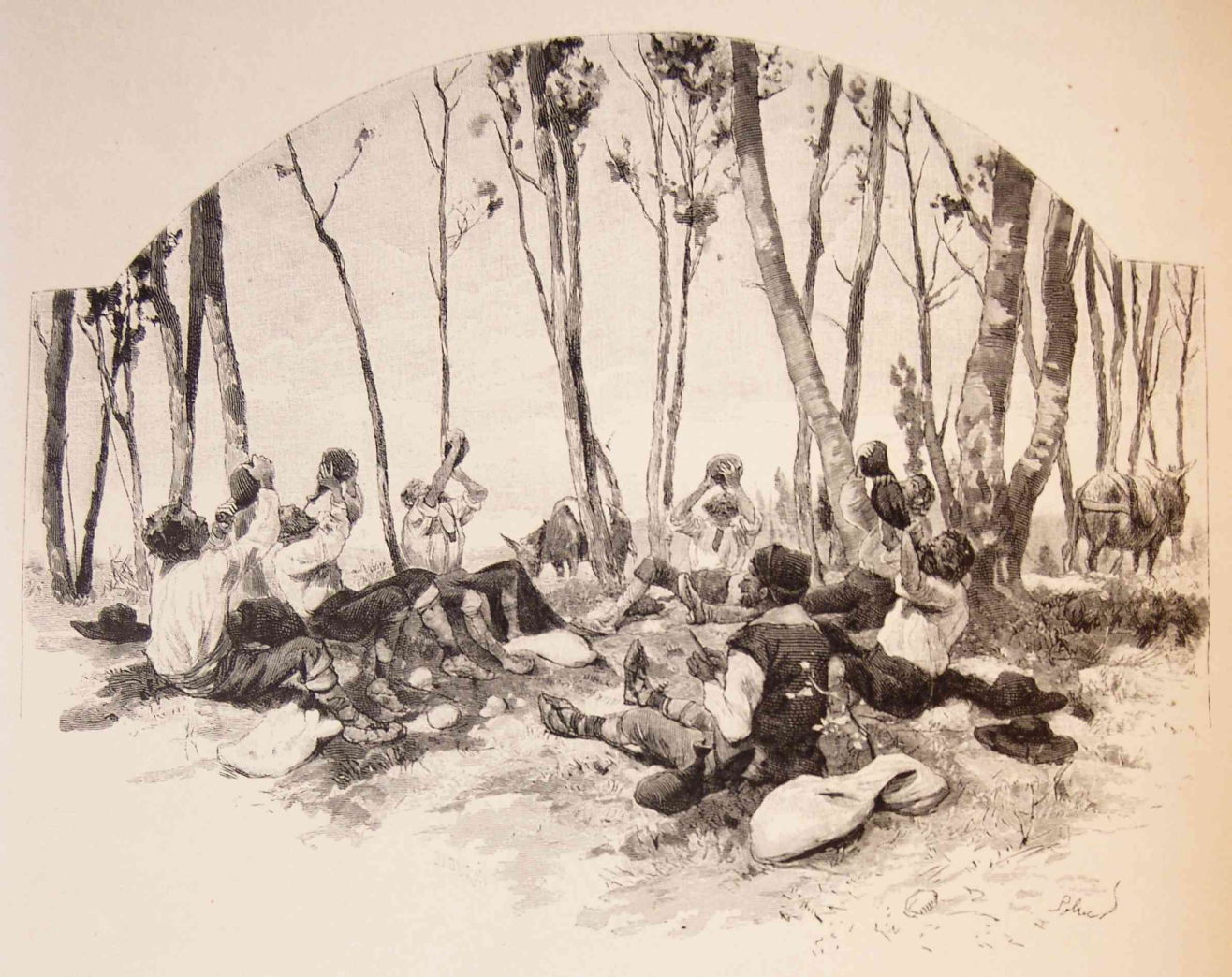 Sancho was riding his donkey away from his ‘island’ when he came across six pilgrims, whom he presumed were asking him for alms. He gave them some bread and cheese, and tried to ride through their line. One of them revealed that he was Sancho’s village shopkeeper and his neighbour, a Spanish Moor. They all went over to a grove of poplars where they ate lunch and drank large quantities of wine.