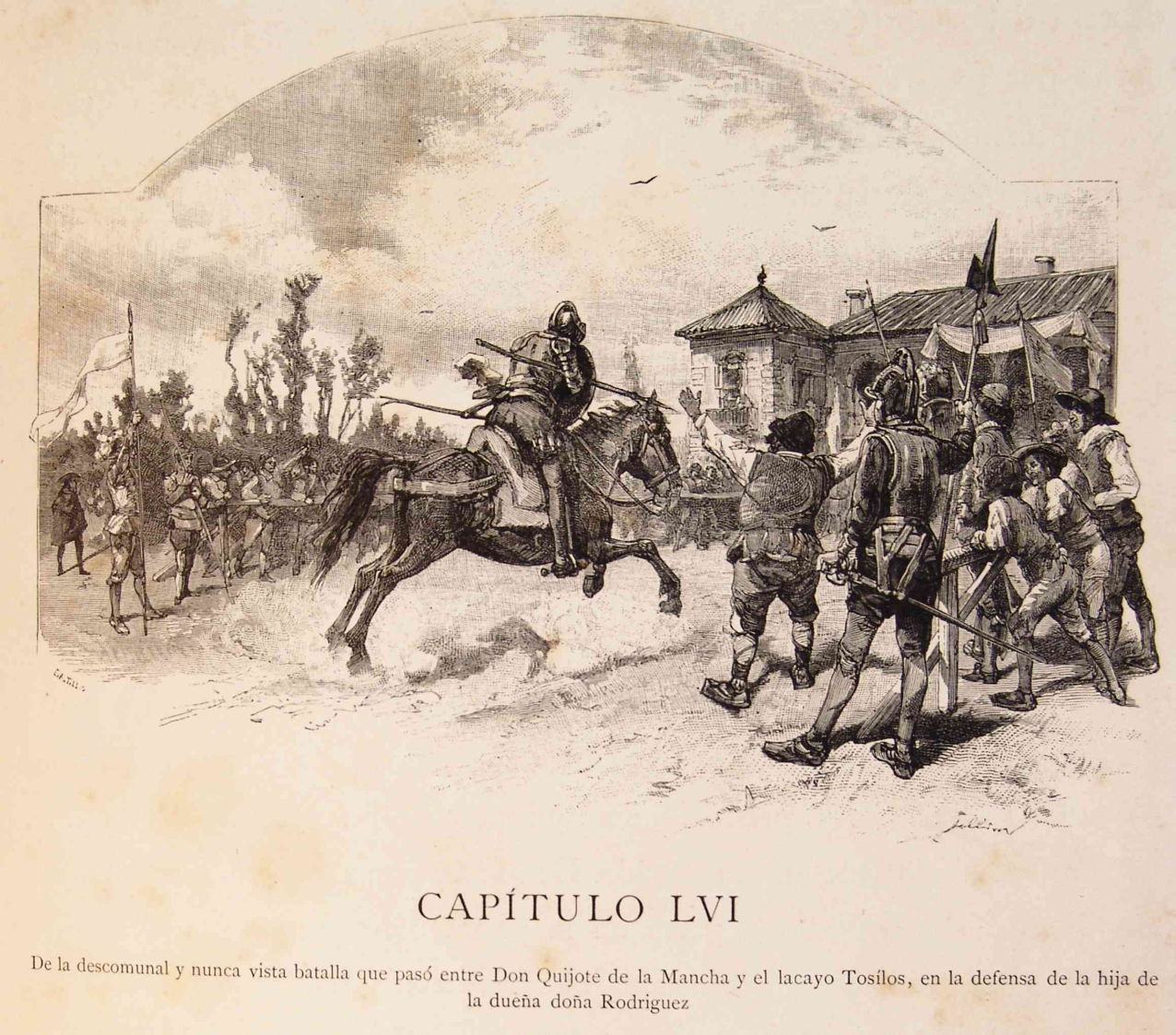 Over the next few days the Duke schooled Don Quixote’s opponent so that he should defeat the knight without injuring him, and had the tips removed from their lances in preparation. When the day came for the two to do battle, a platform was built in the castle square for the large crowd of onlookers. Shortly after Don Quixote had arrived, his opponent appeared amid a great fanfare. The proxy was dressed in smart armour and was riding a powerful charger.