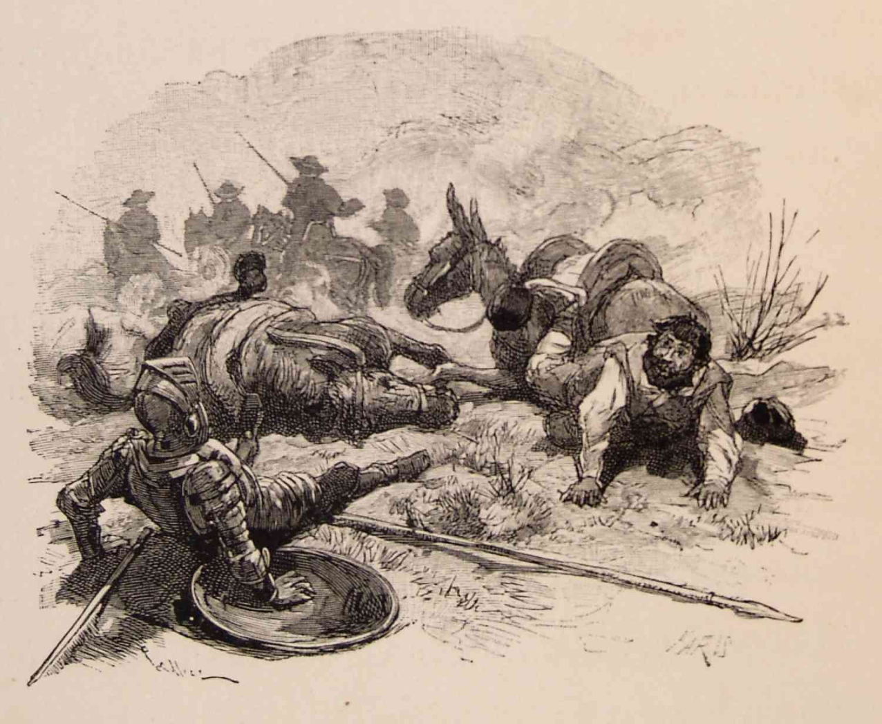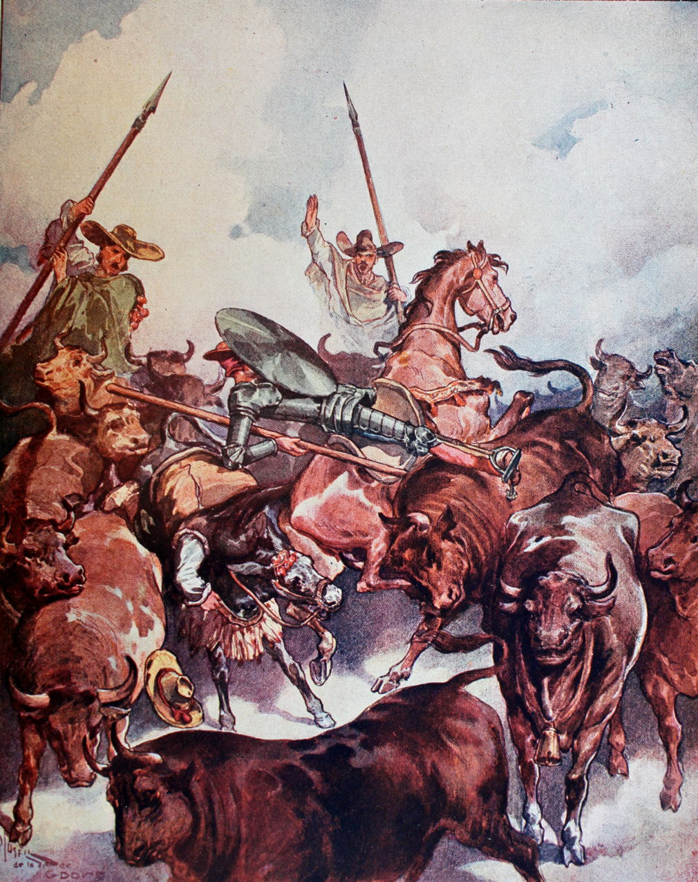 They next saw a group of men with lances riding fast towards them. One of that group rode ahead and warned them to get out of the way of the bulls that were approaching. The knight refused to budge, and he and Sancho were almost immediately engulfed by the herd of bulls being driven to a bullfight. Don Quixote, Sancho Panza and their mounts were knocked over and trampled.