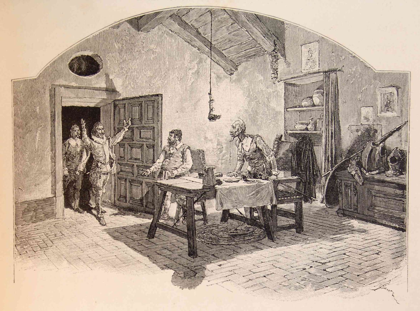 After Sancho had told the men in the next room that they were speaking to the real Don Quixote, the two of them went round to the knight’s room and embraced him with delight. The knight started to criticise the book’s contents, including its allegations that Sancho was a simple-minded glutton. The two men invited the knight and his squire to share their dinner, which was a feast compared to the meal provided by the landlord.