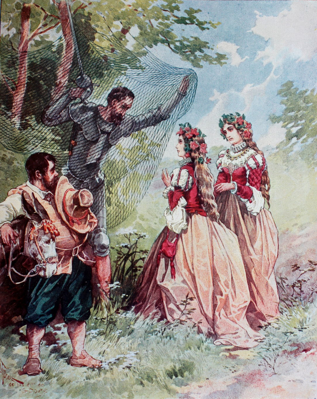 The knight and his squire then talked about Altisidora, in which Sancho accused his master of being cold and heartless in rejecting her advances. While the knight was responding to that they entered a wood, and he became tangled up in green nets hung between the trees. As he struggled to break through that netting, two beautiful young women dressed as shepherdesses emerged from the trees.