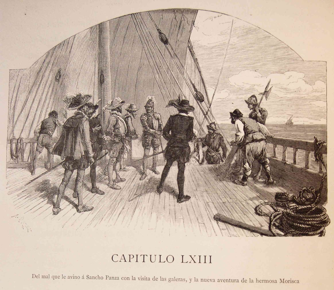 That afternoon, Don Antonio took the pair and two of his friends to visit the galleys moored off the beach. The commodore of the vessels was delighted to show them off, and as the party set foot on the beach a pinnace was launched to collect them and take them across the short stretch of sea. When Don Quixote boarded the galley, he was honoured by the firing of cannon and the galley-slaves shouting in unison. The commodore took them to the poop for them to watch its crew, who first stripped to the waist then raised the awning.