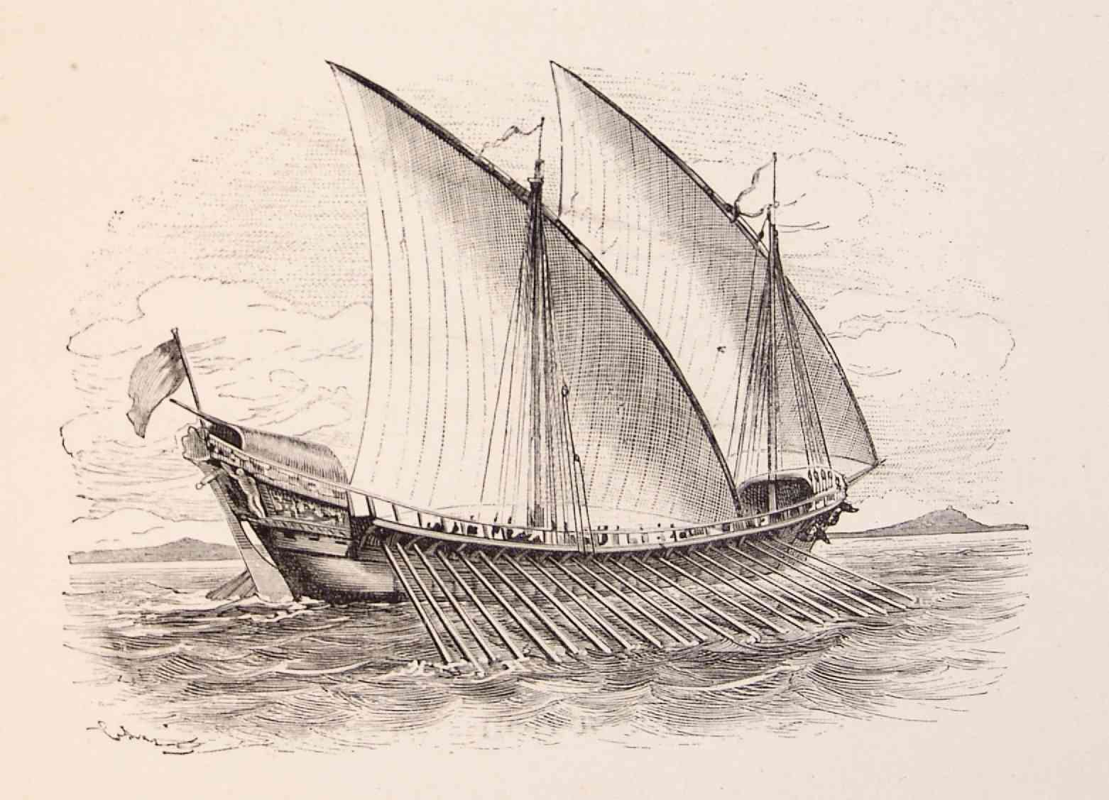 One of the crew seized Sancho and he was rolled along in the air on the arms of all the slaves on that side of the galley, and back down the other side to be dropped on the poop. Next the slaves lowered the awning and lowered the lateen-yard to the bottom of the mast, making a din that plainly scared Sancho. The yard was raised again, and the galley weighed anchor as the slaves rowed it out to sea with the other three galleys alongside.