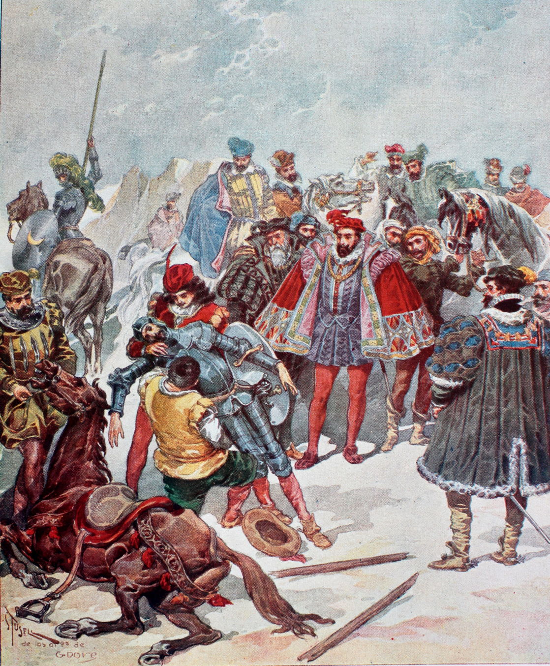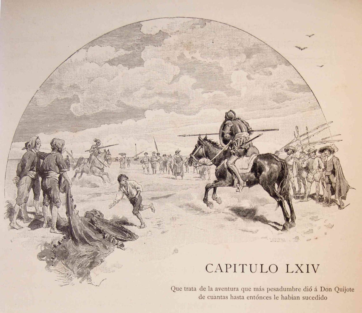 The two knights turned their horses round and started their charge almost immediately. Although the Knight of the White Moon didn’t touch Don Quixote with his lance, the force of his charge knocked both Don Quixote and Rocinante to the ground. With the knight still sprawled on the ground, White Moon held his lance to his opponent’s closed visor and demanded satisfaction.