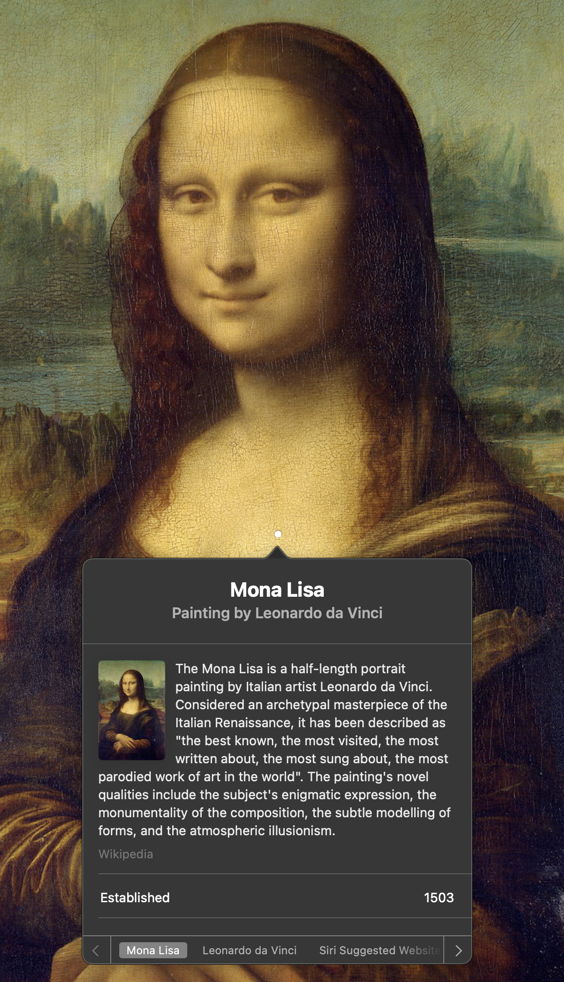 Select that, and a new QuickLook Preview floating window should appear, with the image inside it. One or more white spots should be present on the image, and one of them should open automatically giving you the results of the look up. If there are multiple white spots, you can click on each to see the results for that object.
