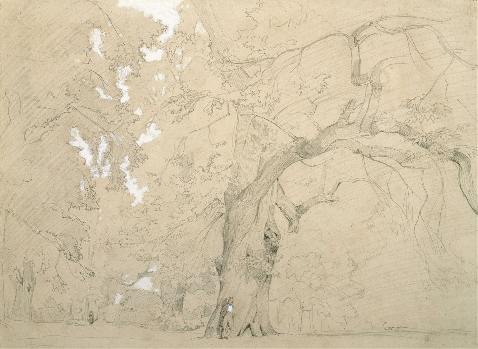 Jean-Baptiste-Camille Corot (1796–1875), Young Man in front of a Great Oak (1840-2), graphite heightened with white gouache on tan paper, 29.2 x 39.8 cm, Museum of Fine Arts, Houston, TX. Wikimedia Commons.