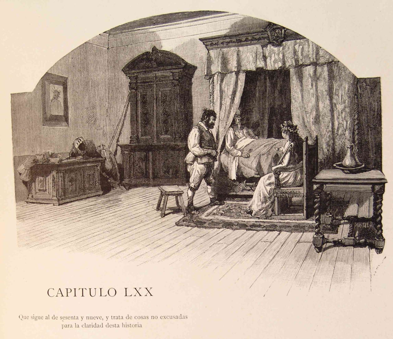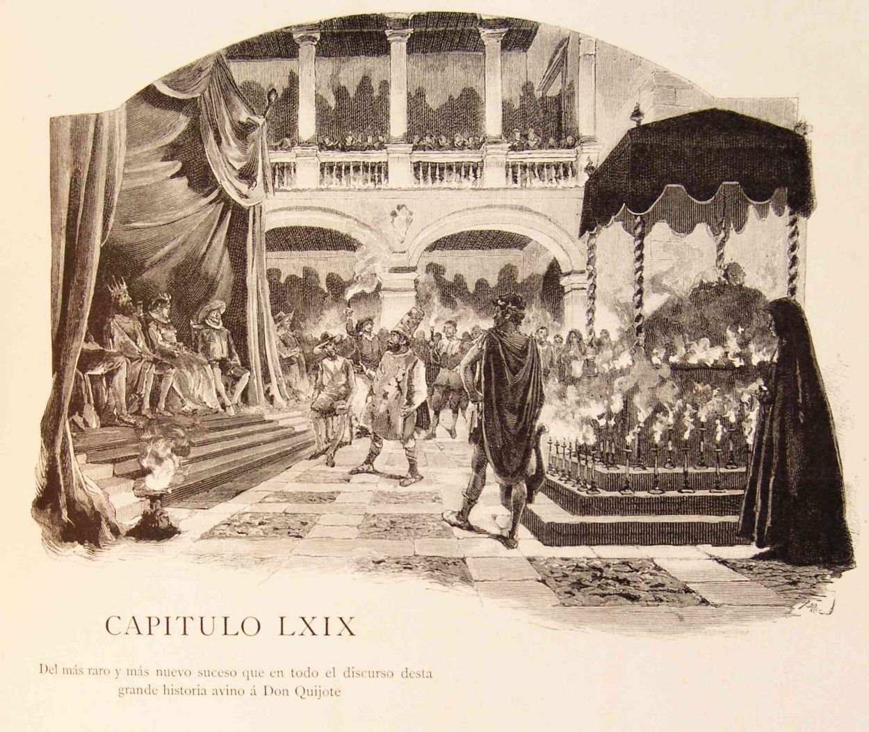 Don Quixote then apologised to her for not returning her affection, but she responded by breaking the news to him that everything they had seen the previous evening had been fake. They were then joined by the young musician who had sung Altisidora’s praise by her catafalque, and soon after by the Duke and Duchess.
