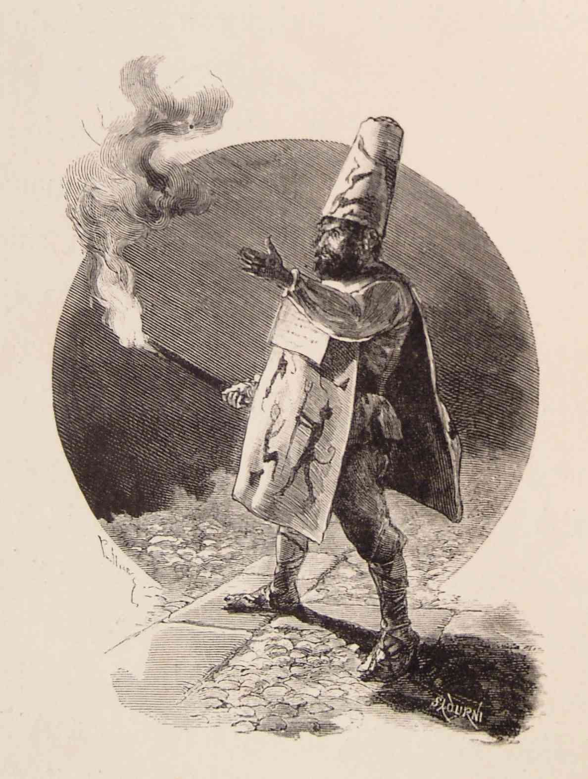 At this point, Don Quixote realised the body in front of them was that of Altisidora. Servants put a black cloak with flames painted on it over Sancho, and a conical hat with devils on it on his head, whispering in his ear that he must remain in absolute silence. The knight laughed at his appearance.