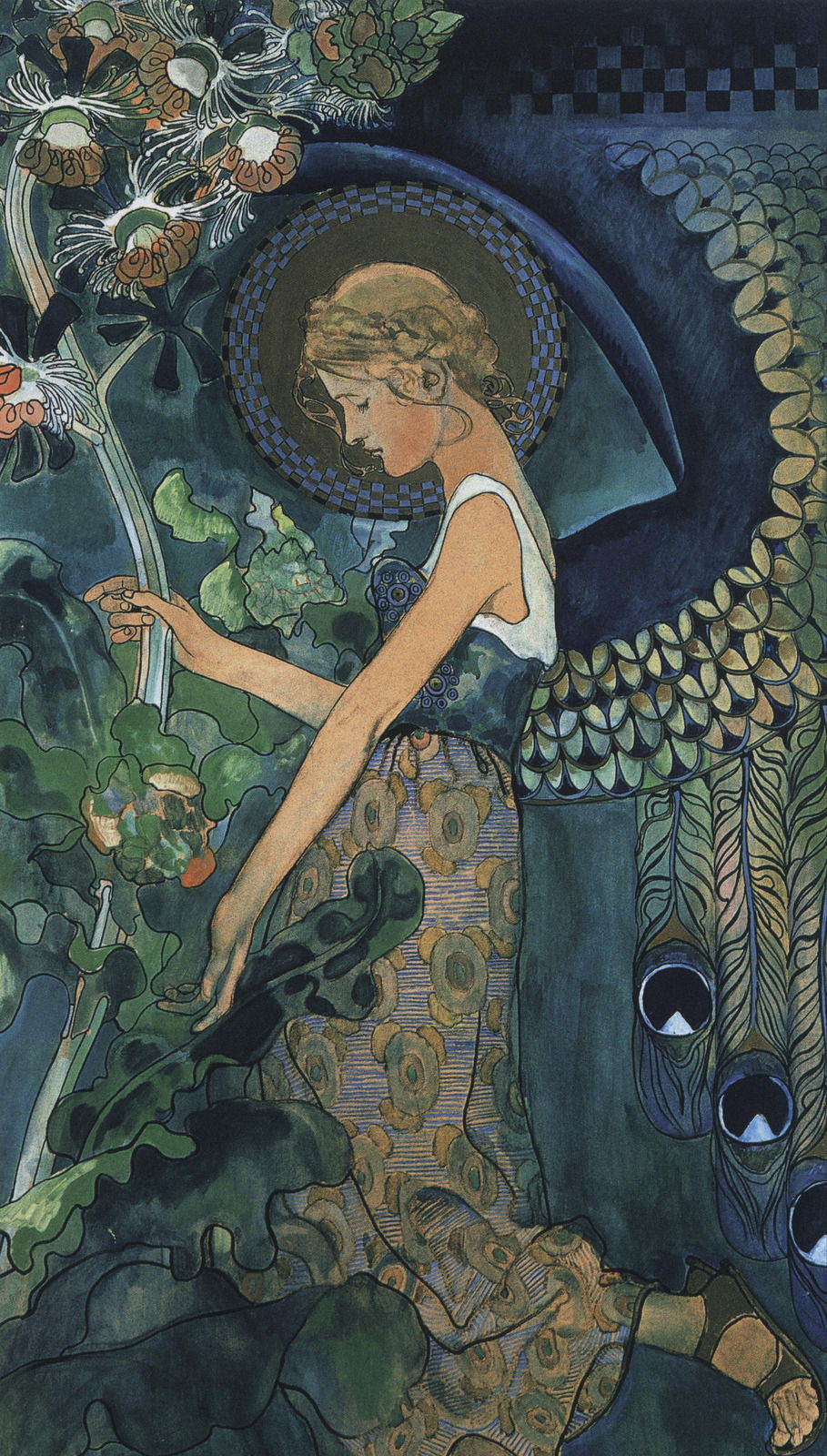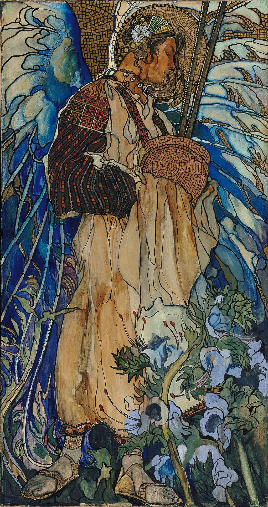 Painted using a combination of tempera and pastel, this triptych is remarkable for its passages which appear to be mosaics, others looking more like stained glass, and its luminous Art Nouveau style.