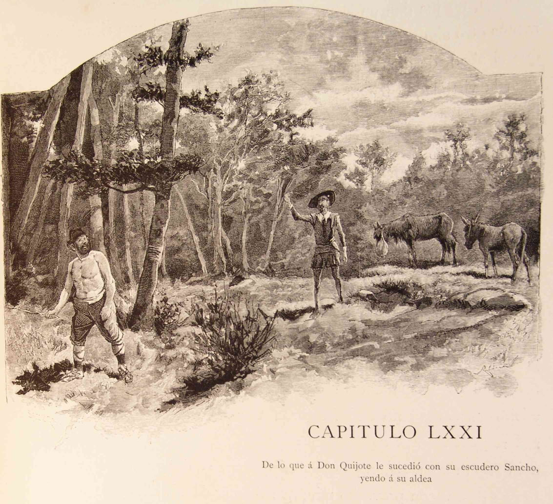 After a short discourse about a crude painting of the rape of Helen that was hung in their ground-floor room, Don Quixote asked Sancho where he intended to flog himself that evening. When his squire said that he needed to be among trees, the knight said he should wait until they reached their village in the next couple of days.