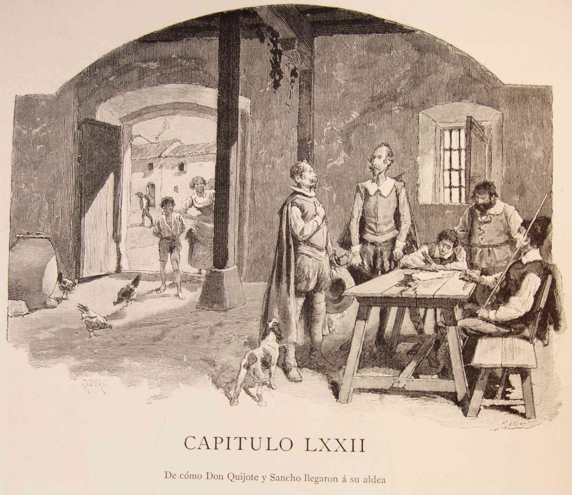 While they were waiting for nightfall, a man on horseback arrived with his servants. Don Quixote overheard his name, Don Álvaro Tarfè, which he recognised from the published second book of Don Quixote. That traveller was given the room opposite Don Quixote’s. When they bumped into one another in the porch of the inn, Don Quixote confirmed the man’s identity, and learned that he was riding to Granada.