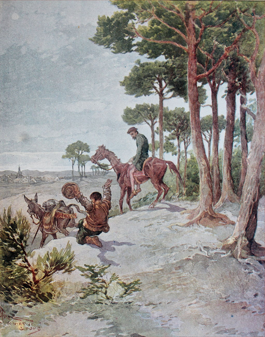 That evening the three rode away, and parted company where the road divided to Don Quixote’s village. The knight and his squire soon got off that road and found some trees where Sancho could continue with his lashing. As before, the squire whipped the trees rather than his body, and by the morning had reached the grand total of three thousand and twenty-nine strokes.